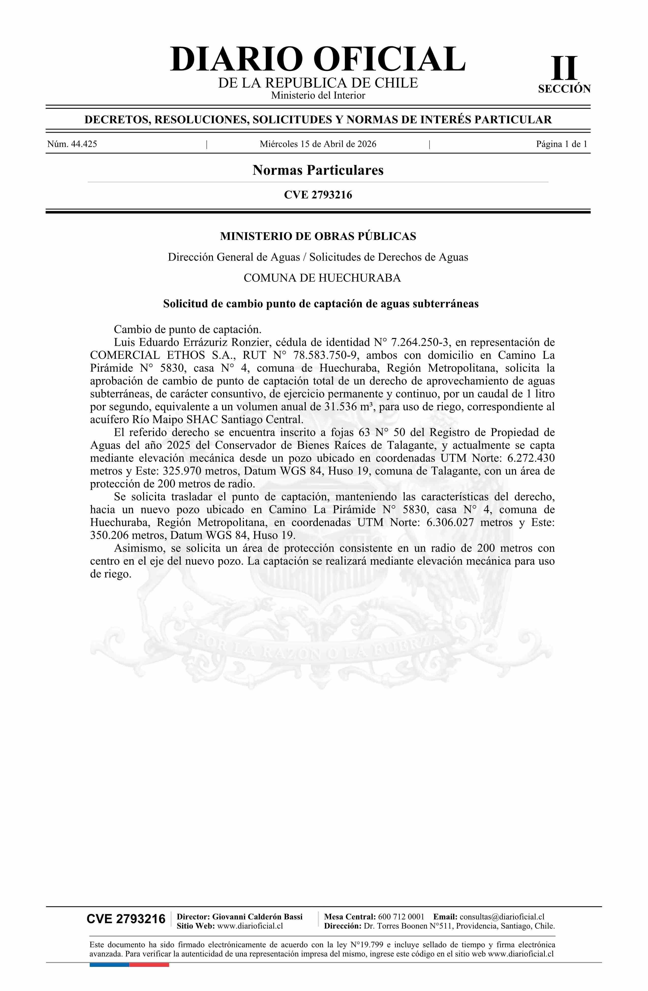 Solicitud Comercial Ethos S.A. 15-04-2026 Diario Oficial Edición Electrónica |