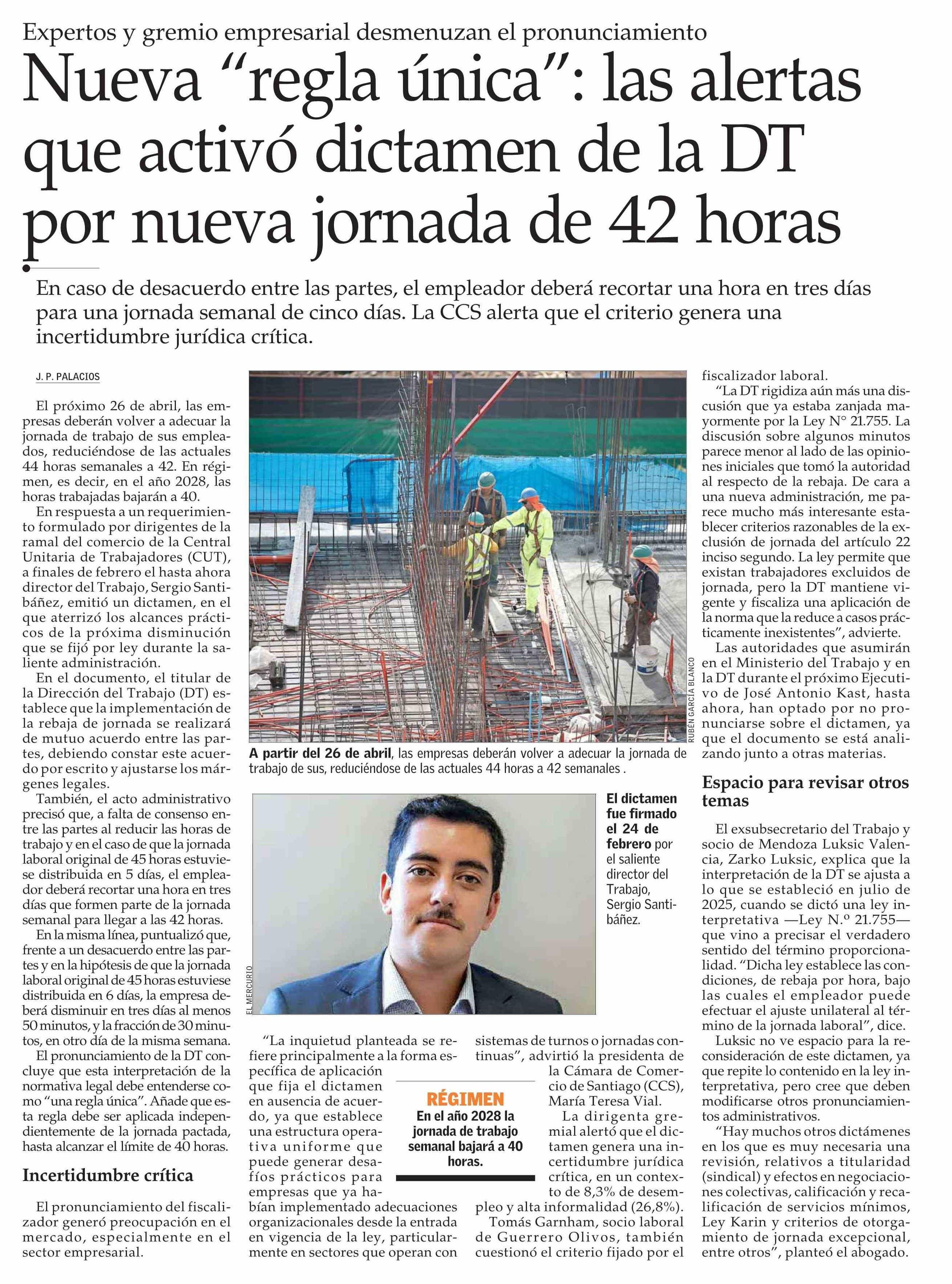 Nueva “regla única”: las alertas que activó dictamen de la DT por nueva jornada de 42 horas 09-03-2026 El Mercurio |