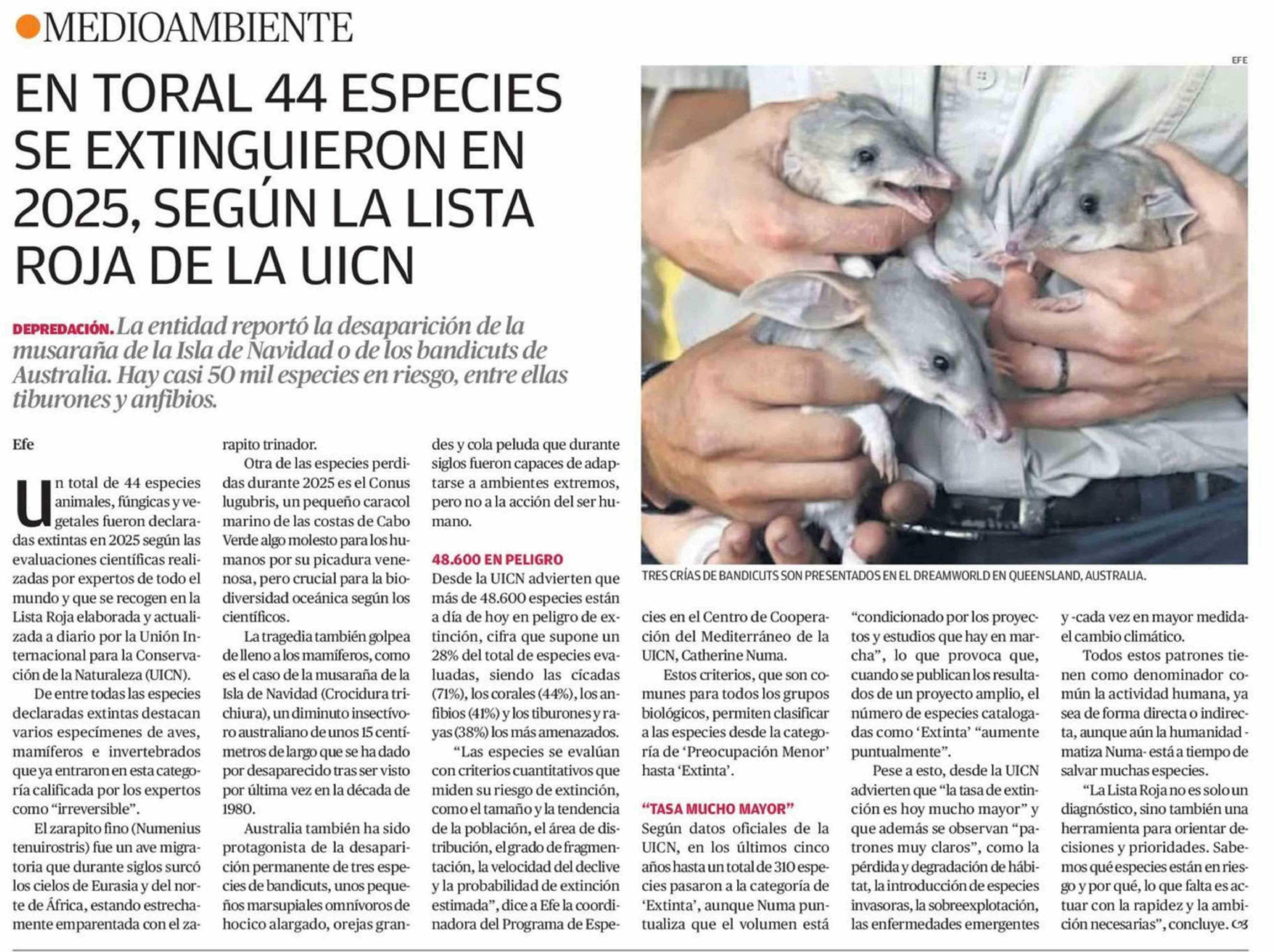 EN TORAL 44 ESPECIES SE EXTINGUIERON EN 2025, SEGÚN LA LISTA ROJA DE LA UICN 02-02-2026 El Mercurio de Antofagasta |