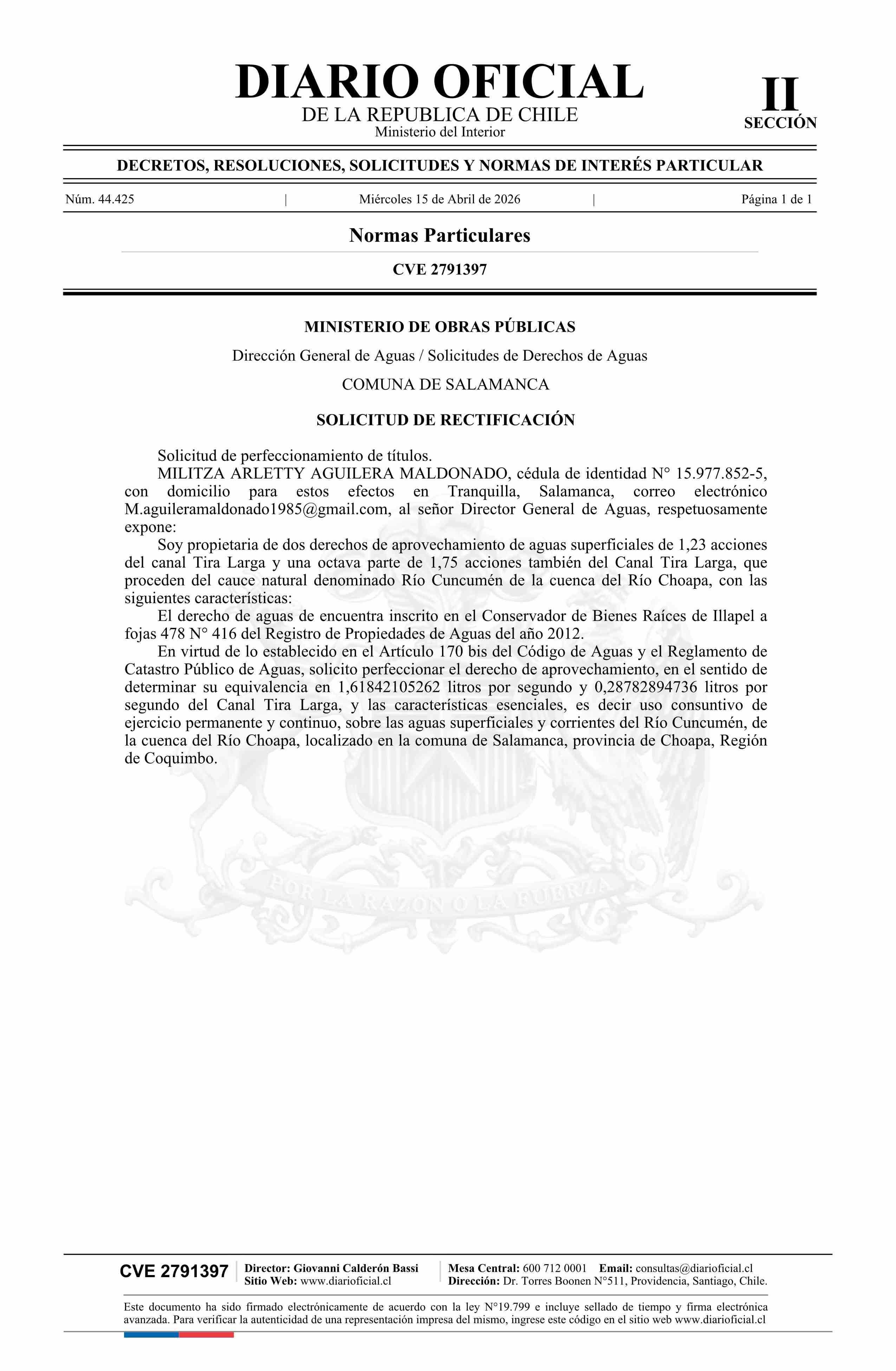 Solicitud Aguilera Maldonado Militza Arletty 15-04-2026 Diario Oficial Edición Electrónica |