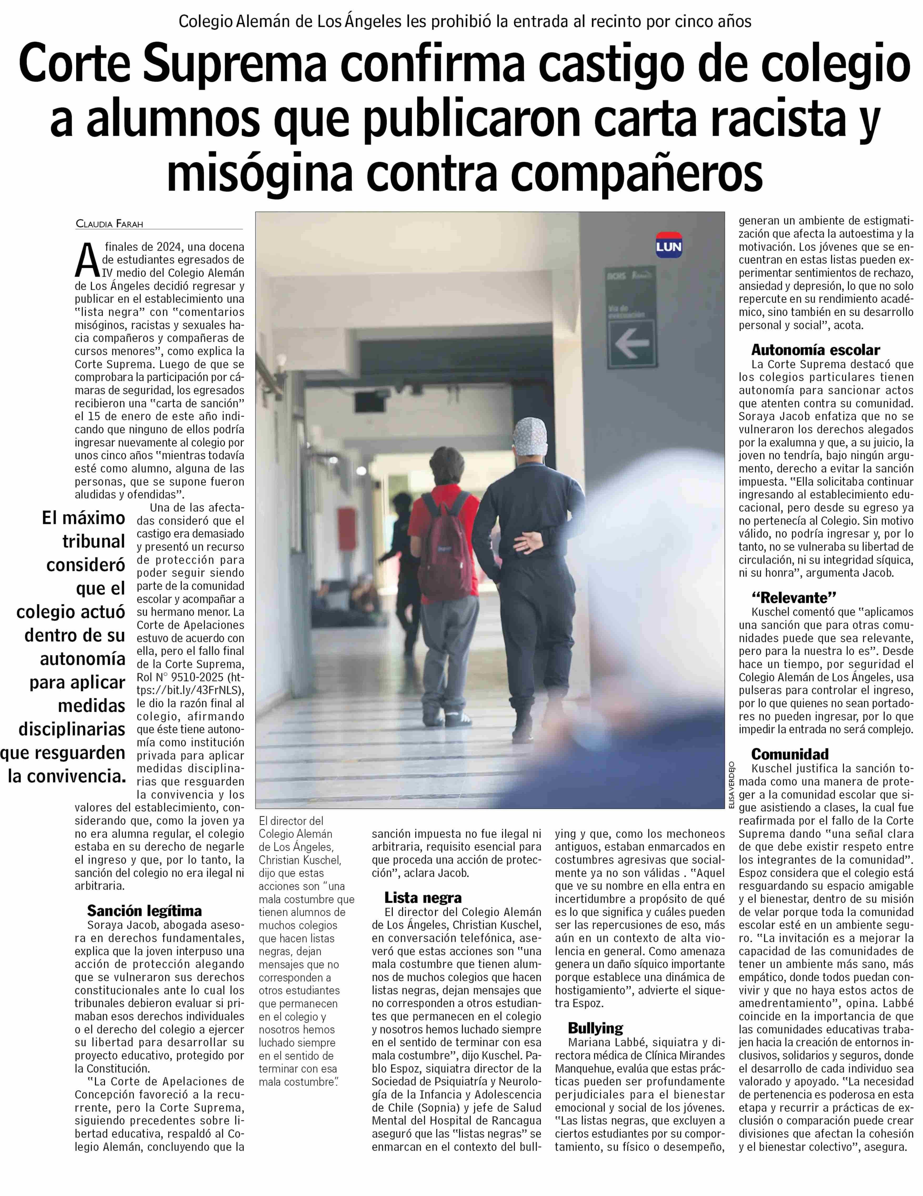 Corte Suprema confirma castigo de colegio a alumnos que publicaron carta racista y misógina contra compañeros 08-06-2025 Las Últimas Noticias |