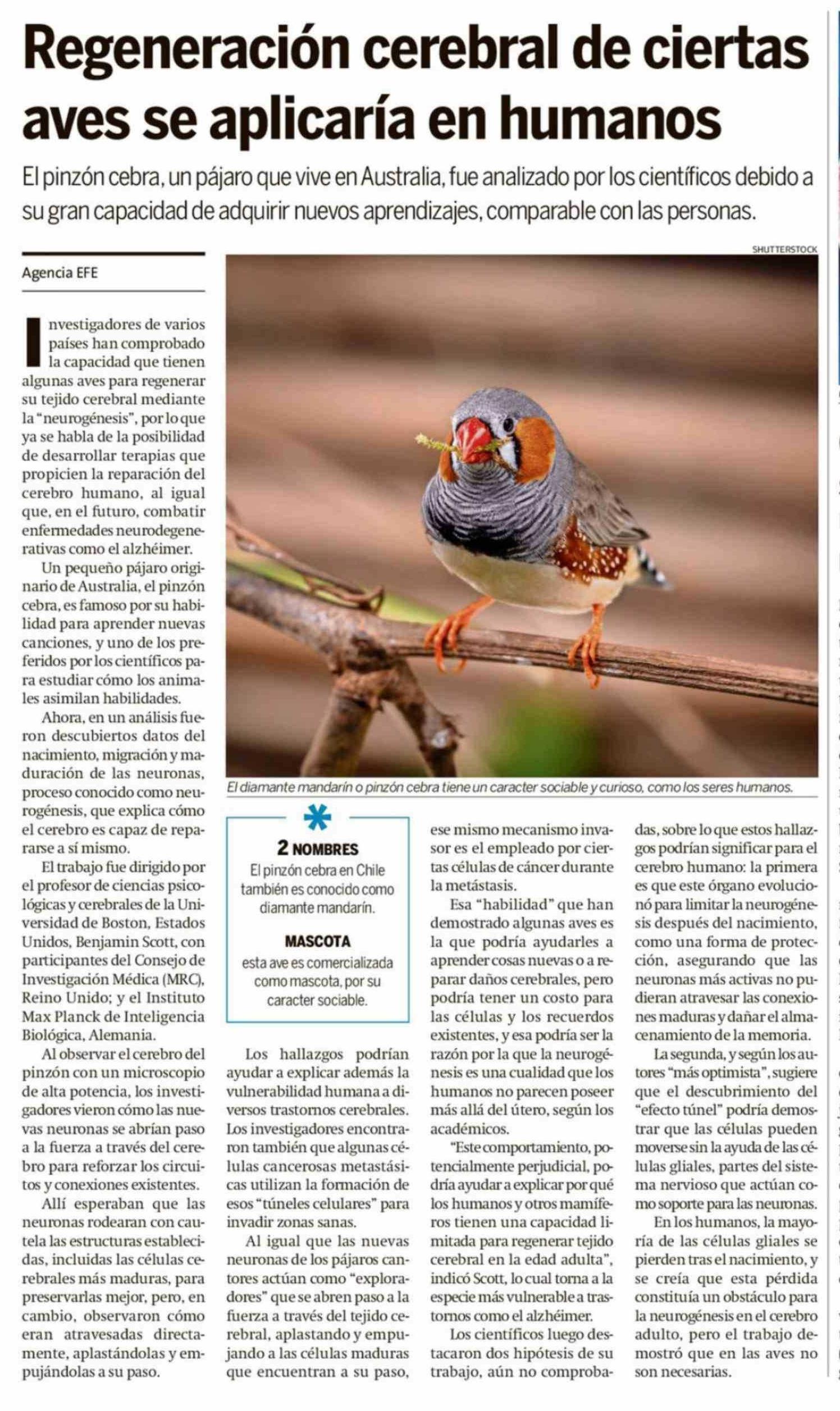 Título: Regeneración cerebral de ciertas aves se aplicaría en humanos