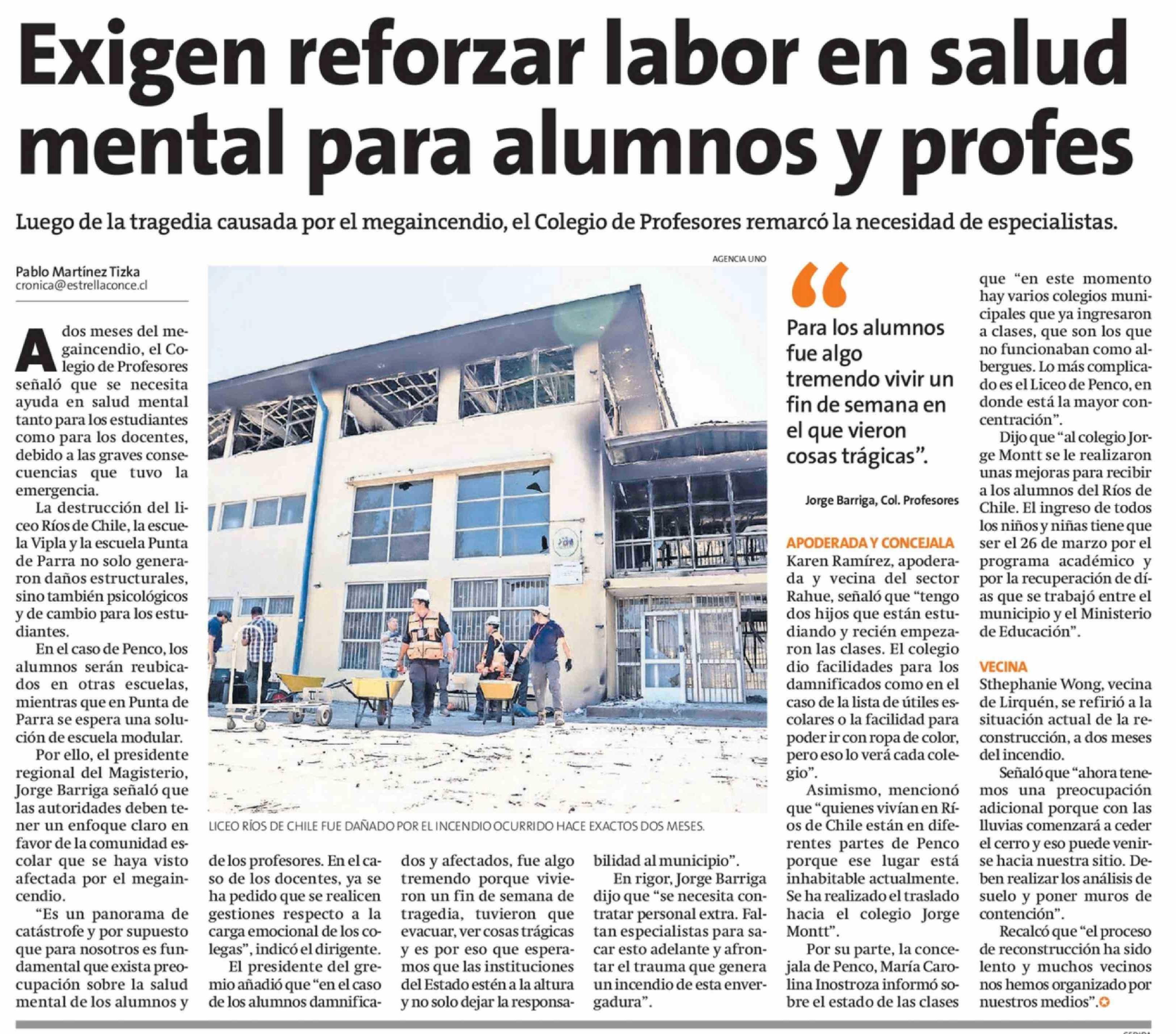 Exigen reforzar labor en salud mental para alumnos y profes 18-03-2026 La Estrella de Concepción |