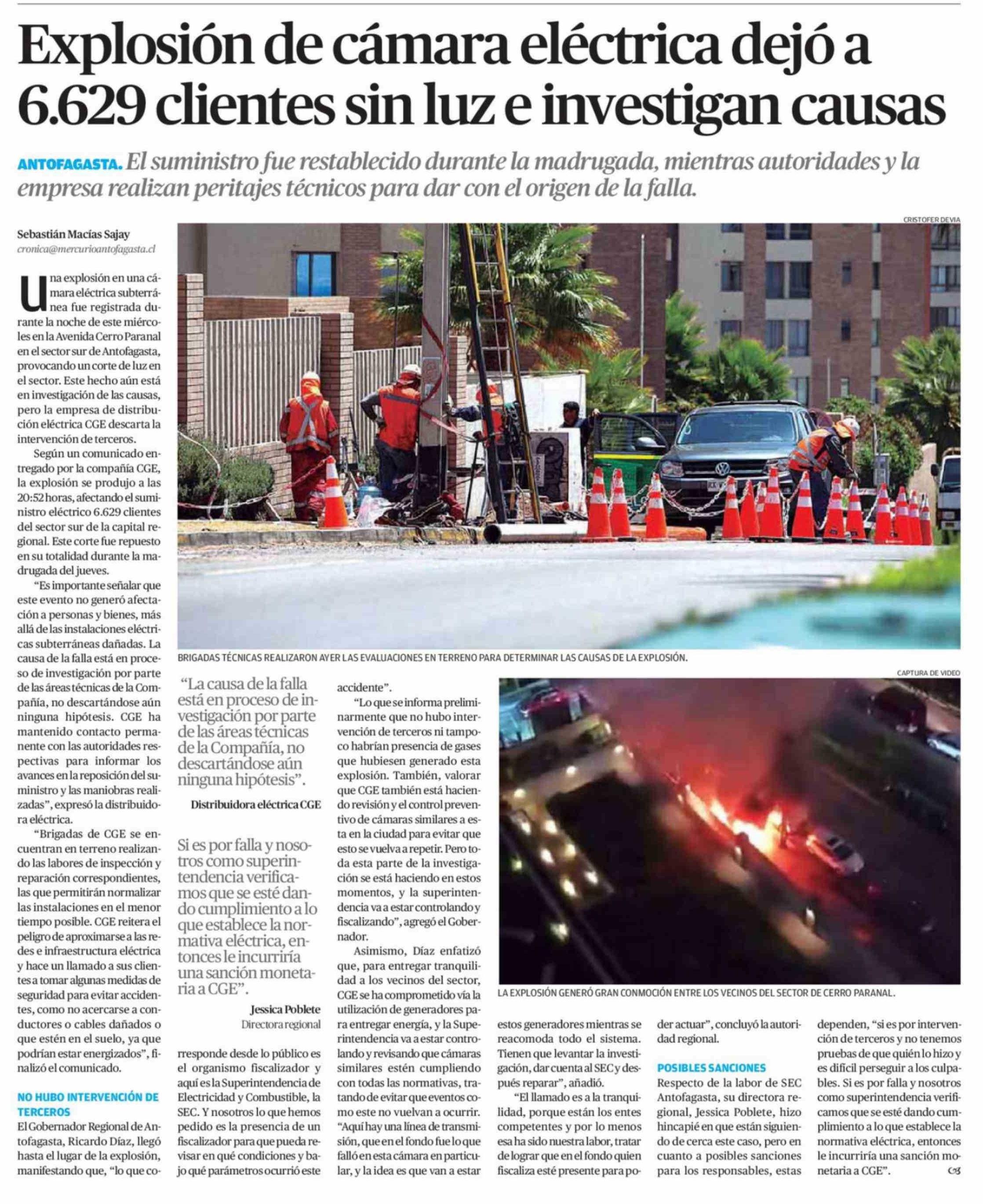 Explosión de cámara eléctrica dejó a 6.629 clientes sin luz e investigan causas 13-02-2026 El Mercurio de Calama |