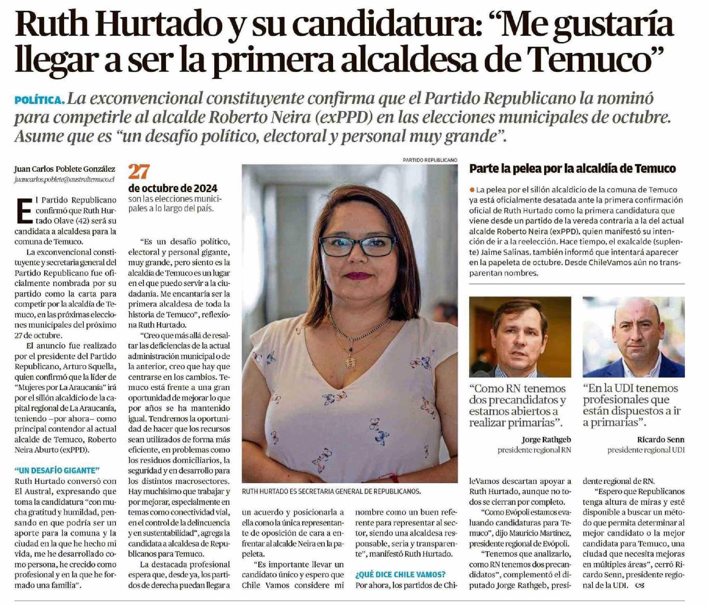 Ruth Hurtado y su candidatura: “Me gustaría llegar a ser la primera alcaldesa de Temuco” 16-01-2024 El Austral de la Araucanía |