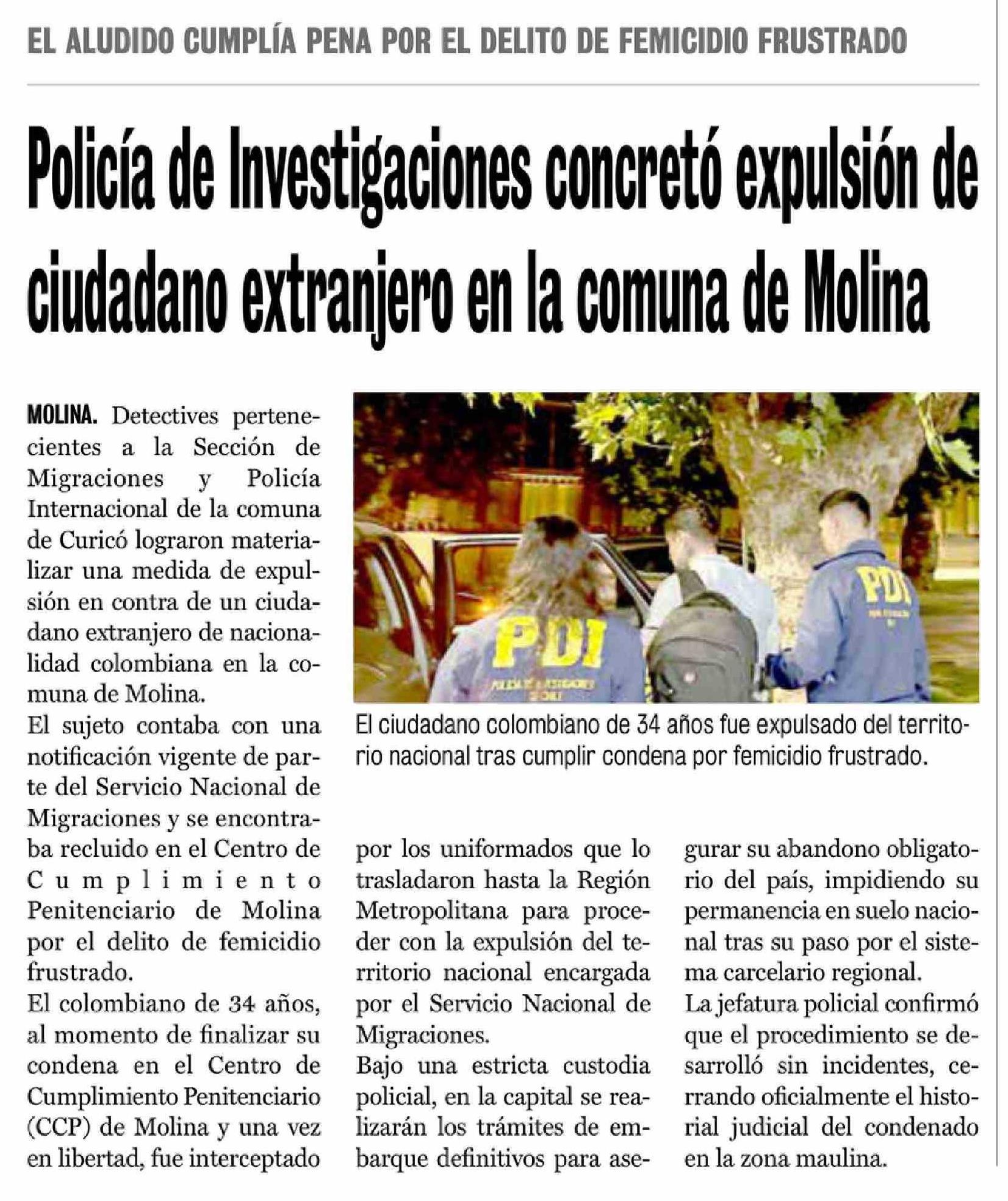Título: Policía de Investigaciones concretó expulsión de ciudadano extranjero en la comuna de Molina