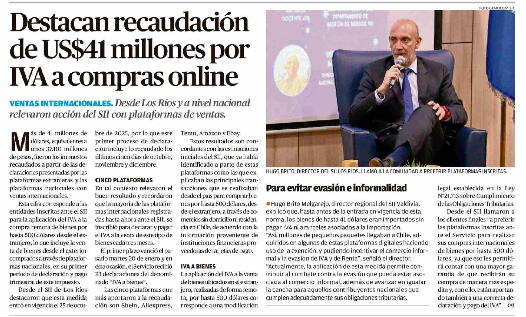 Destacan recaudación de US$41 millones por IVA a compras online 06-02-2026 Diario Austral Región de Los Ríos |