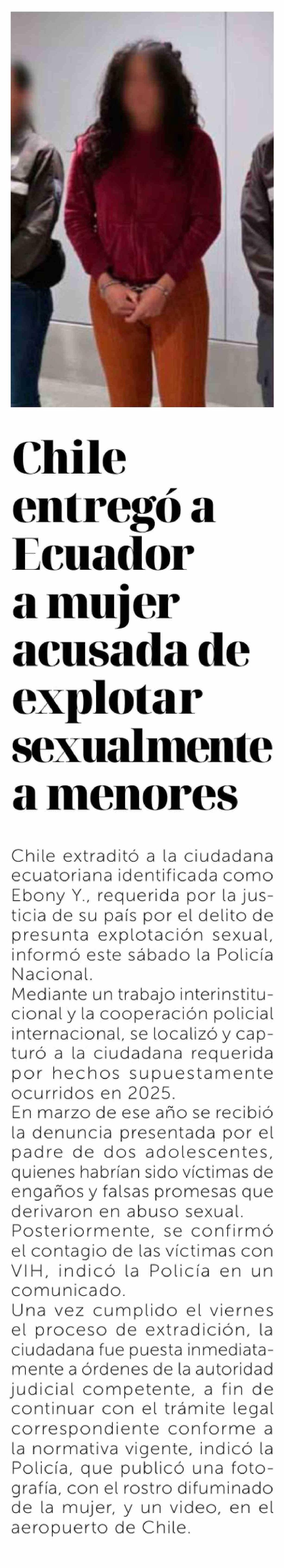 Título: Chile entregó a Ecuador a mujer acusada de explotar sexualmente a menores