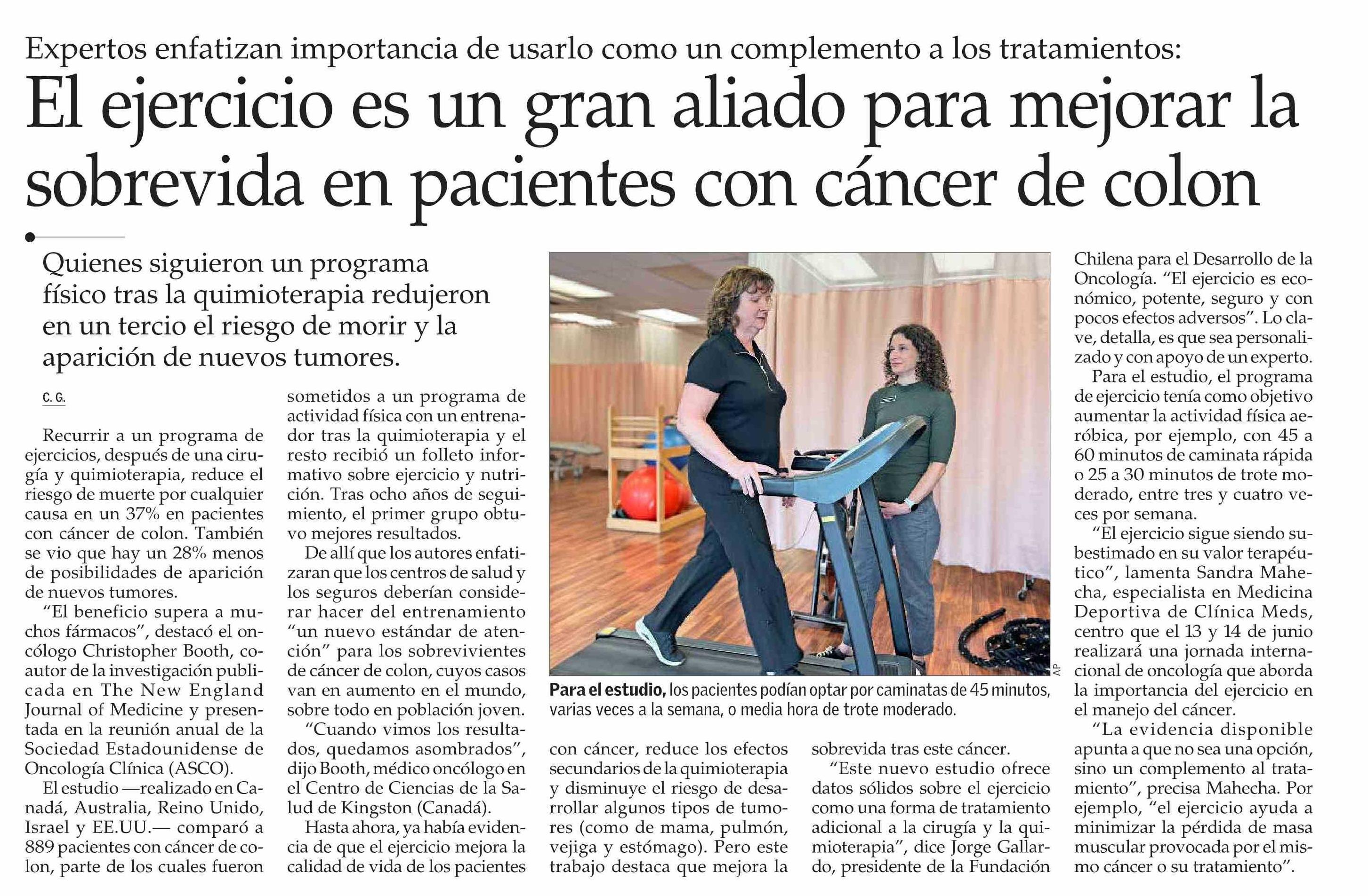 El ejercicio es un gran aliado para mejorar la sobrevida en pacientes con cáncer de colon 04-06-2025 El Mercurio |