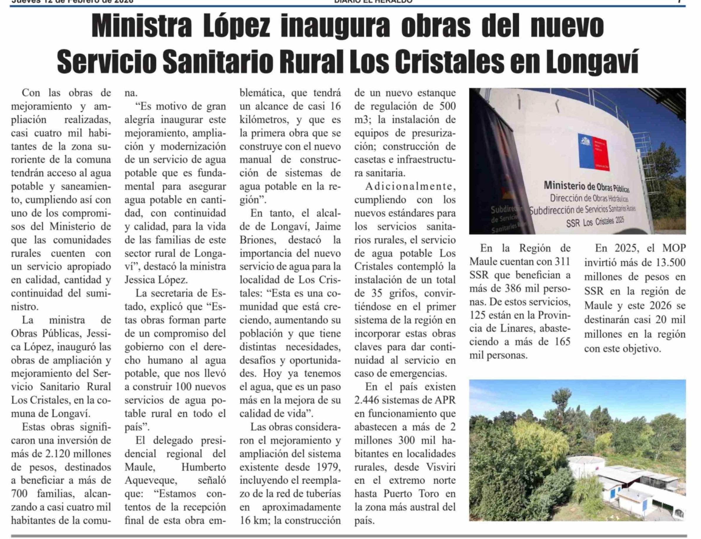 Ministra López inaugura obras del nuevo Servicio Sanitario Rural Los Cristales en Longaví 12-02-2026 El Heraldo |