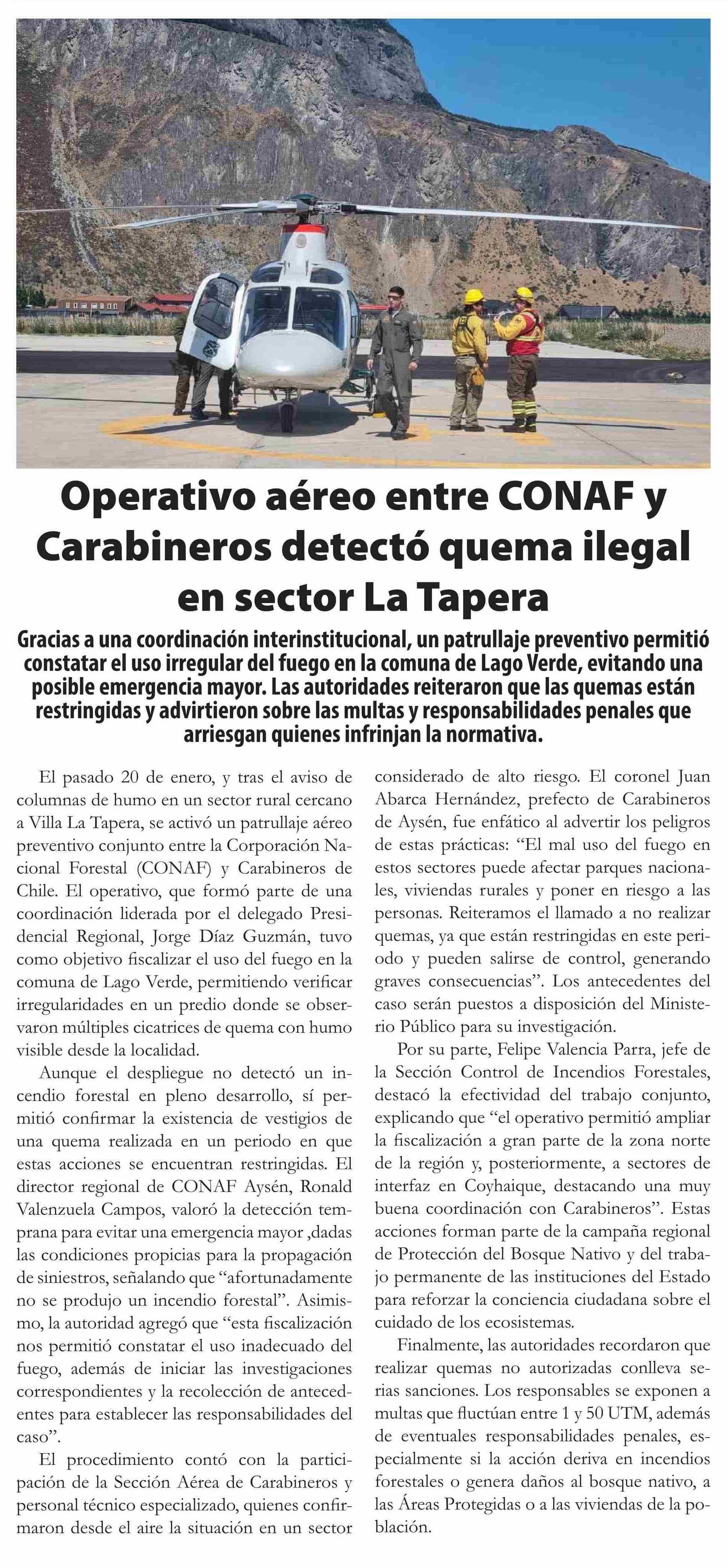 | Título: | Operativo aéreo entre CONAF y Carabineros detectó quema ilegal en sector La Tapera |
