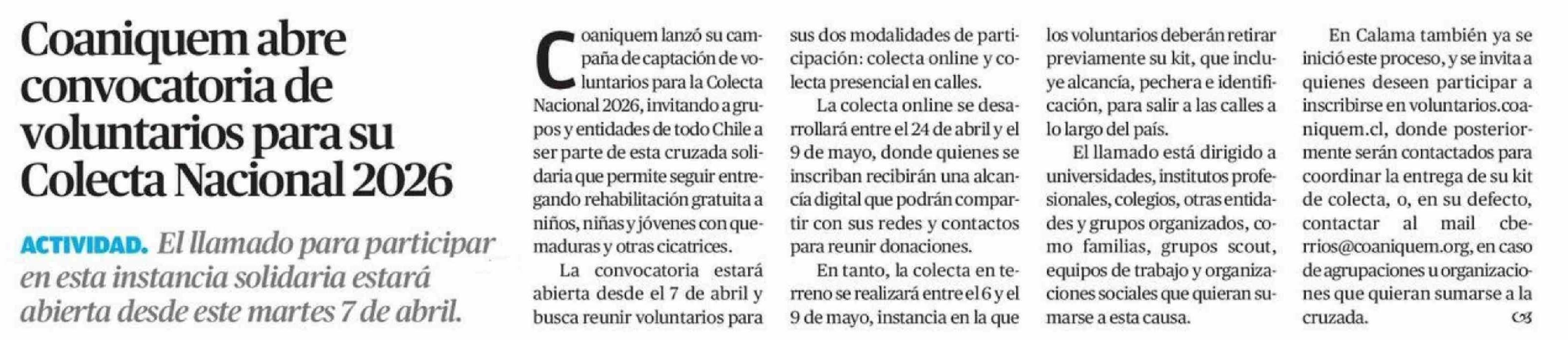 Título: Coaniquem abre convocatoria de voluntarios para su Colecta Nacional 2026