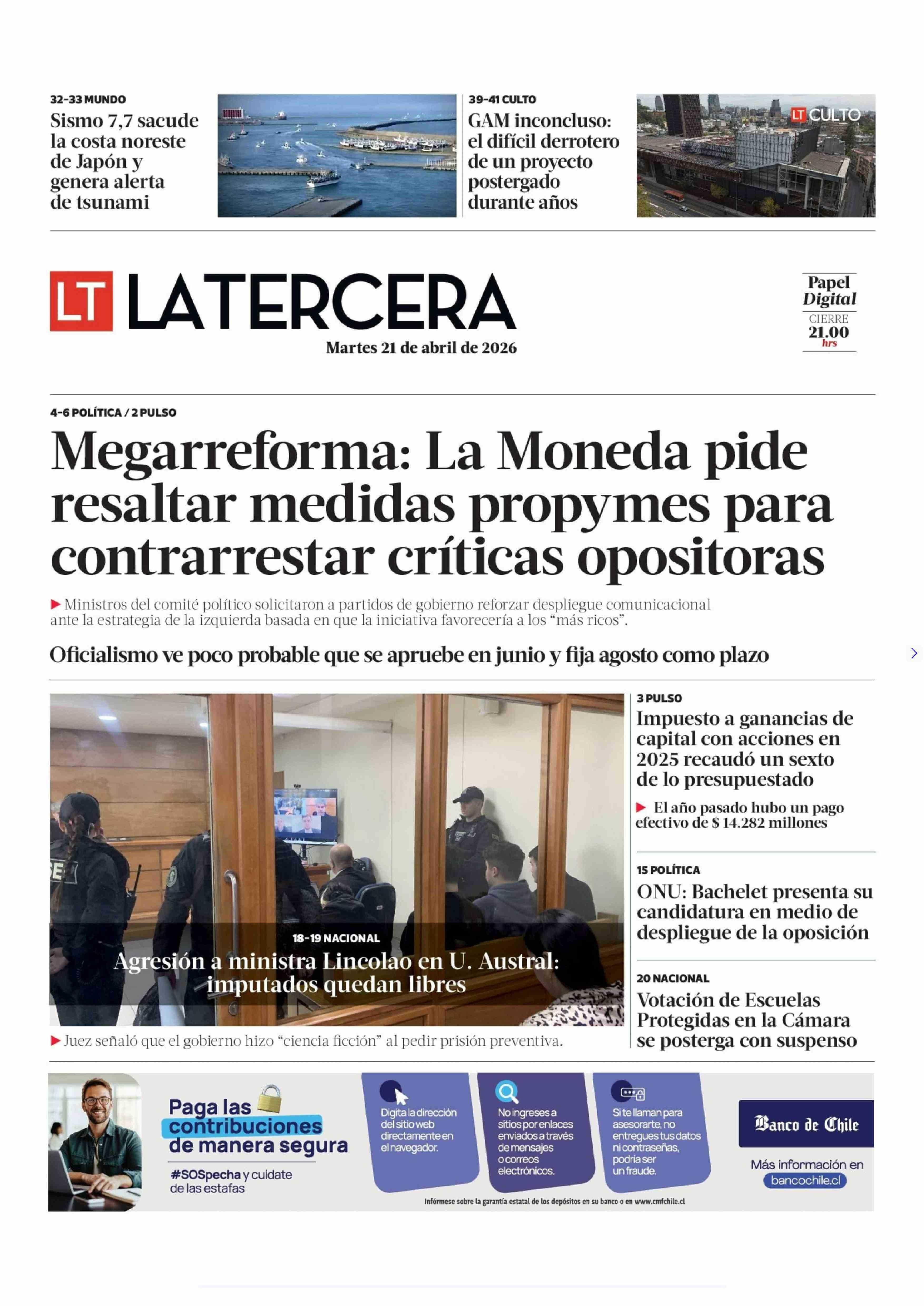 PORTADA LA TERCERA CHILE 21-04-2026 La Tercera |