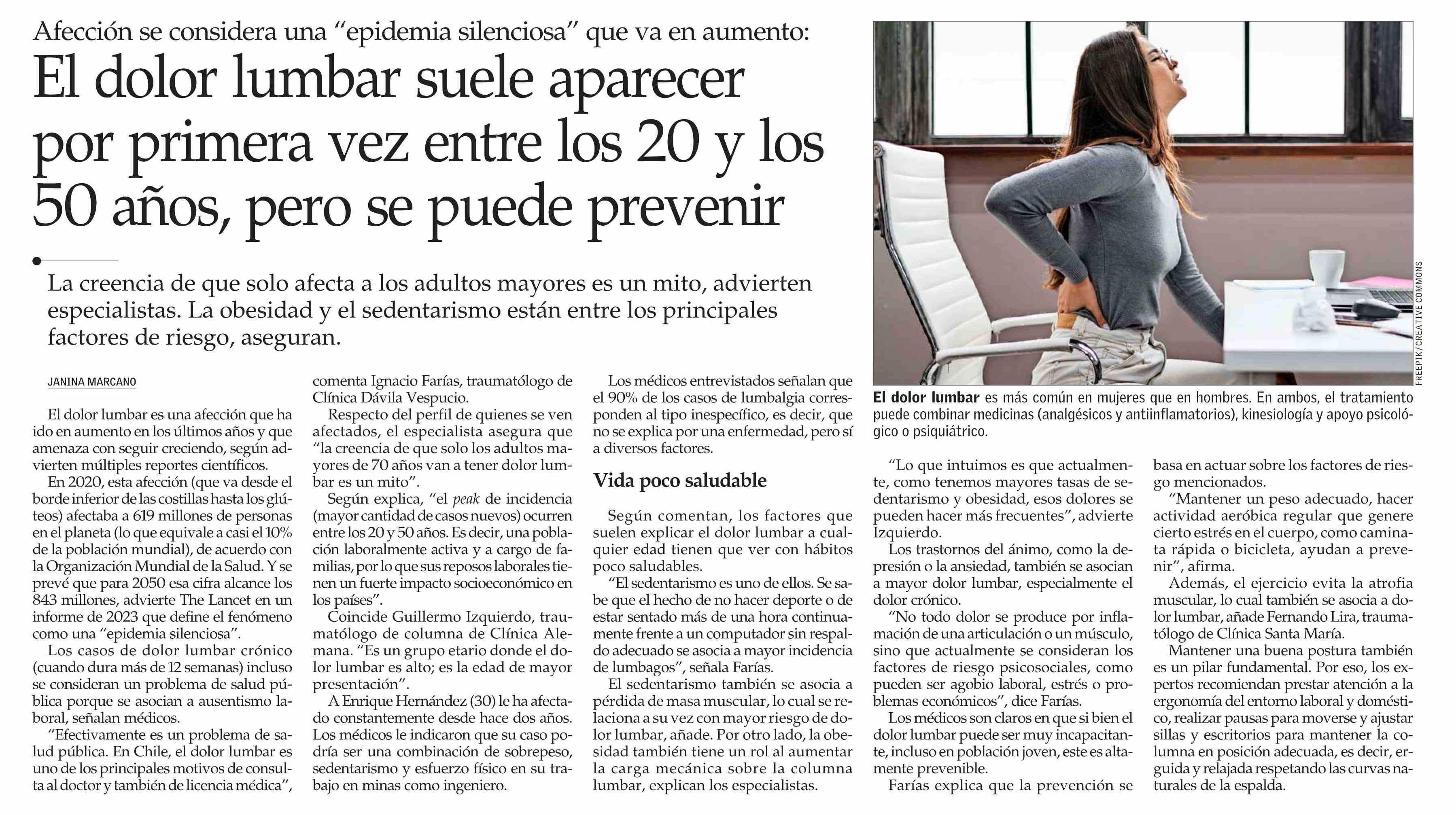 El dolor lumbar suele aparecer por primera vez entre los 20 y los 50 años, pero se puede prevenir 08-06-2025 El Mercurio |