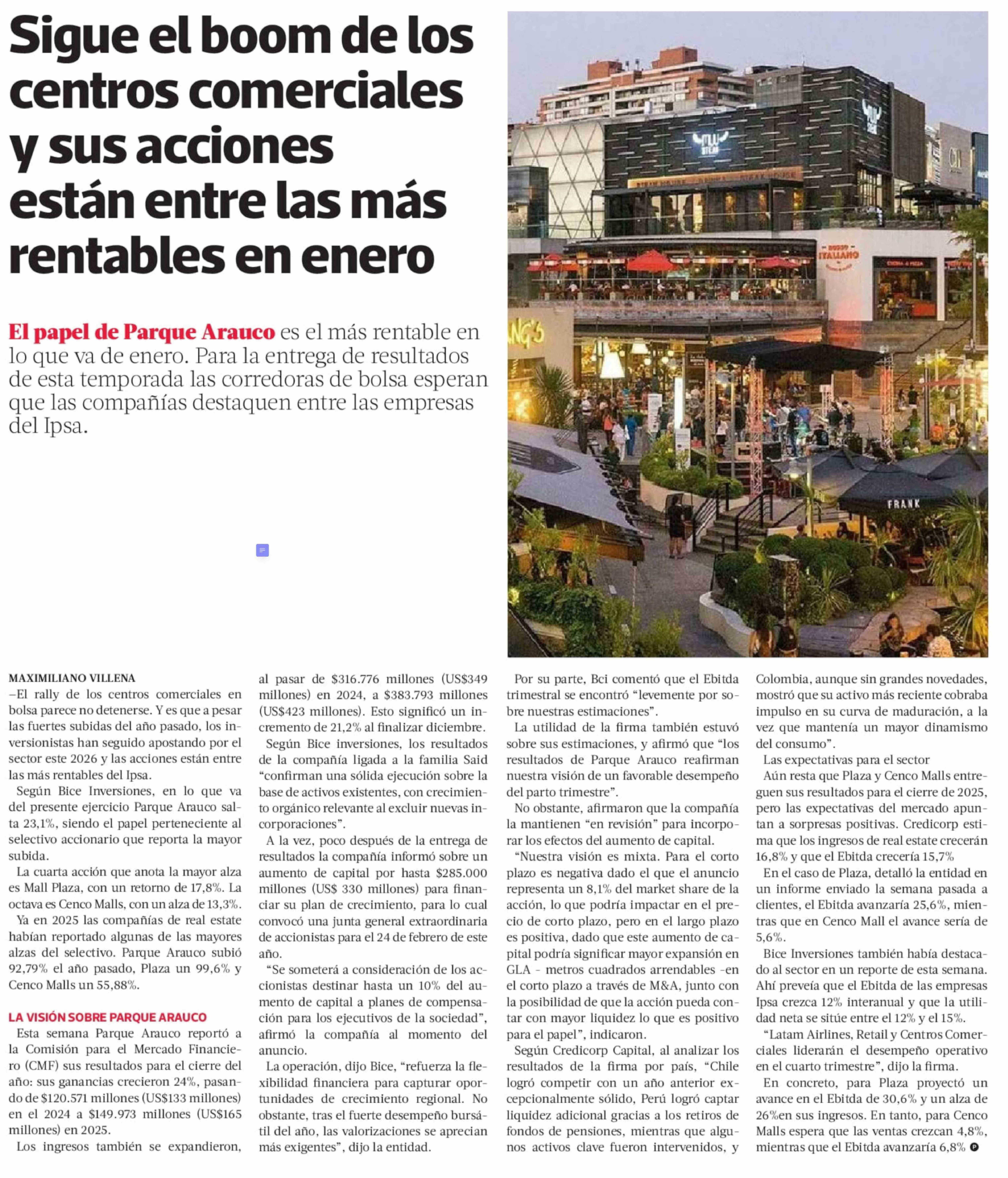 Sigue el boom de los centros comerciales y sus acciones están entre las más rentables en enero 02-02-2026 La Tercera |