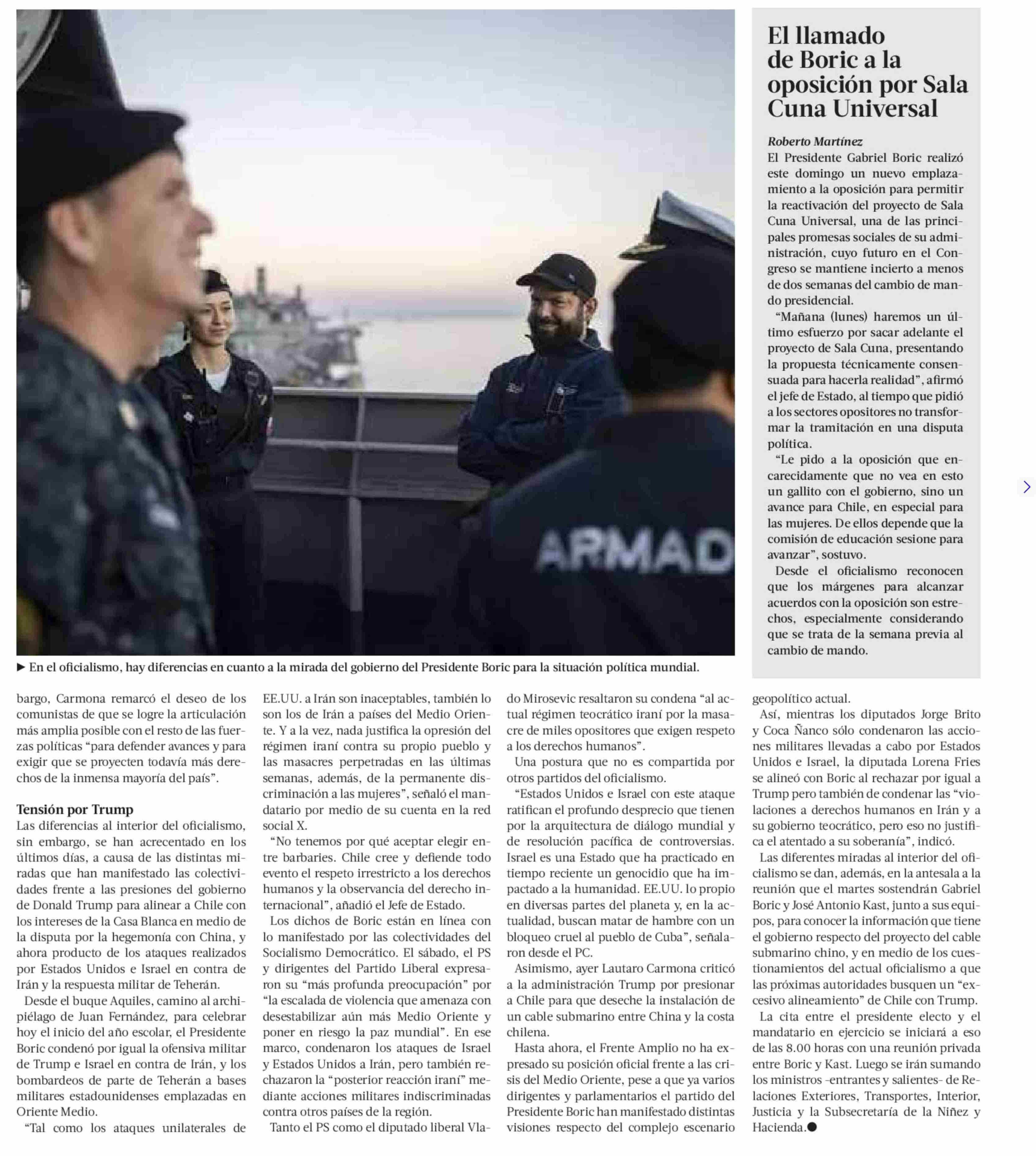 Relación con Trump y guerra en Irán tensionan al oficialismo en la antesala del reinicio del comité ampliado en La Moneda 02-03-2026 La Tercera |
