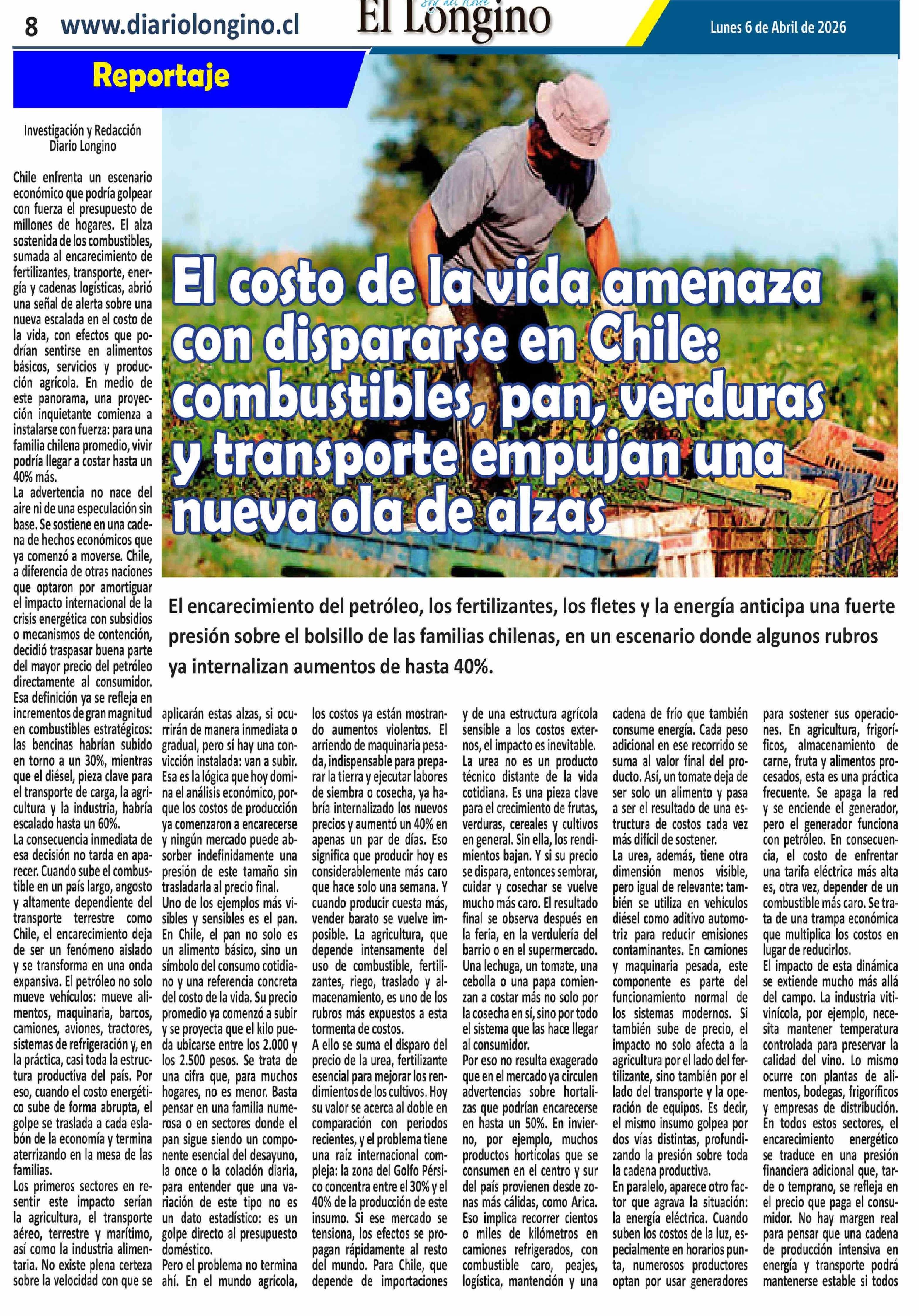 El costo de la vida amenaza con dispararse en Chile: combustibles, pan, verduras y transporte empujan una nueva ola de alzas 06-04-2026 El Longino |