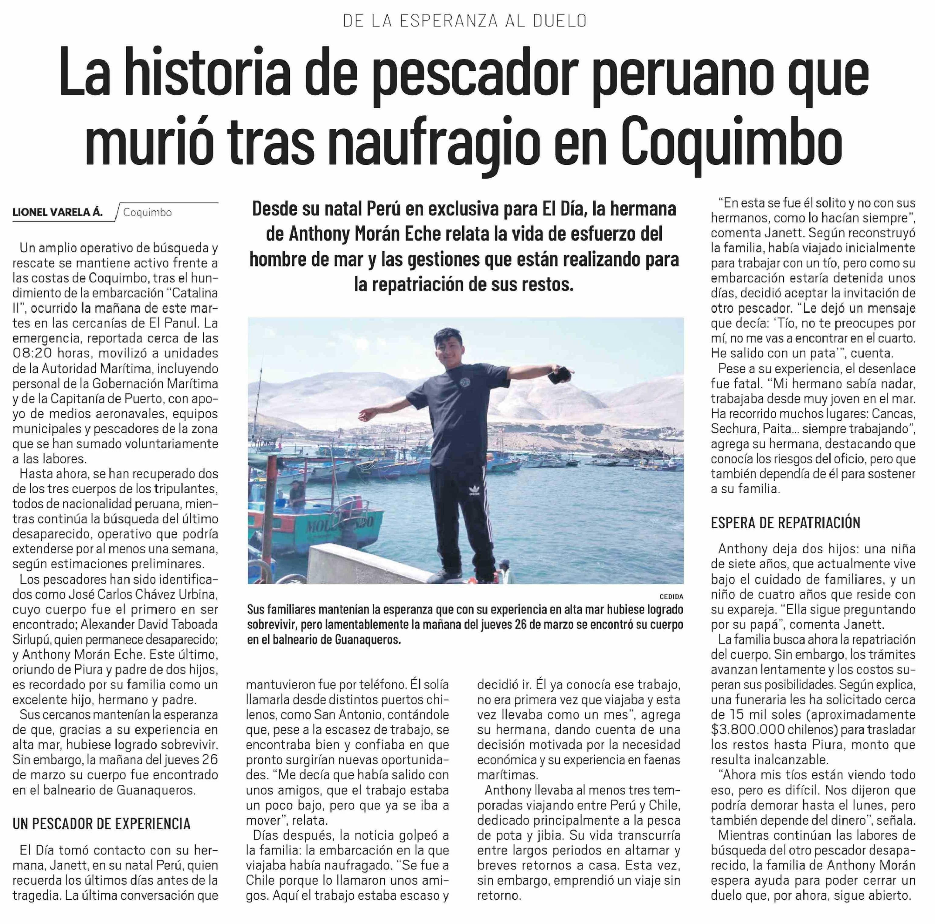 La historia de pescador peruano que murió tras naufragio en Coquimbo 28-03-2026 El Día |