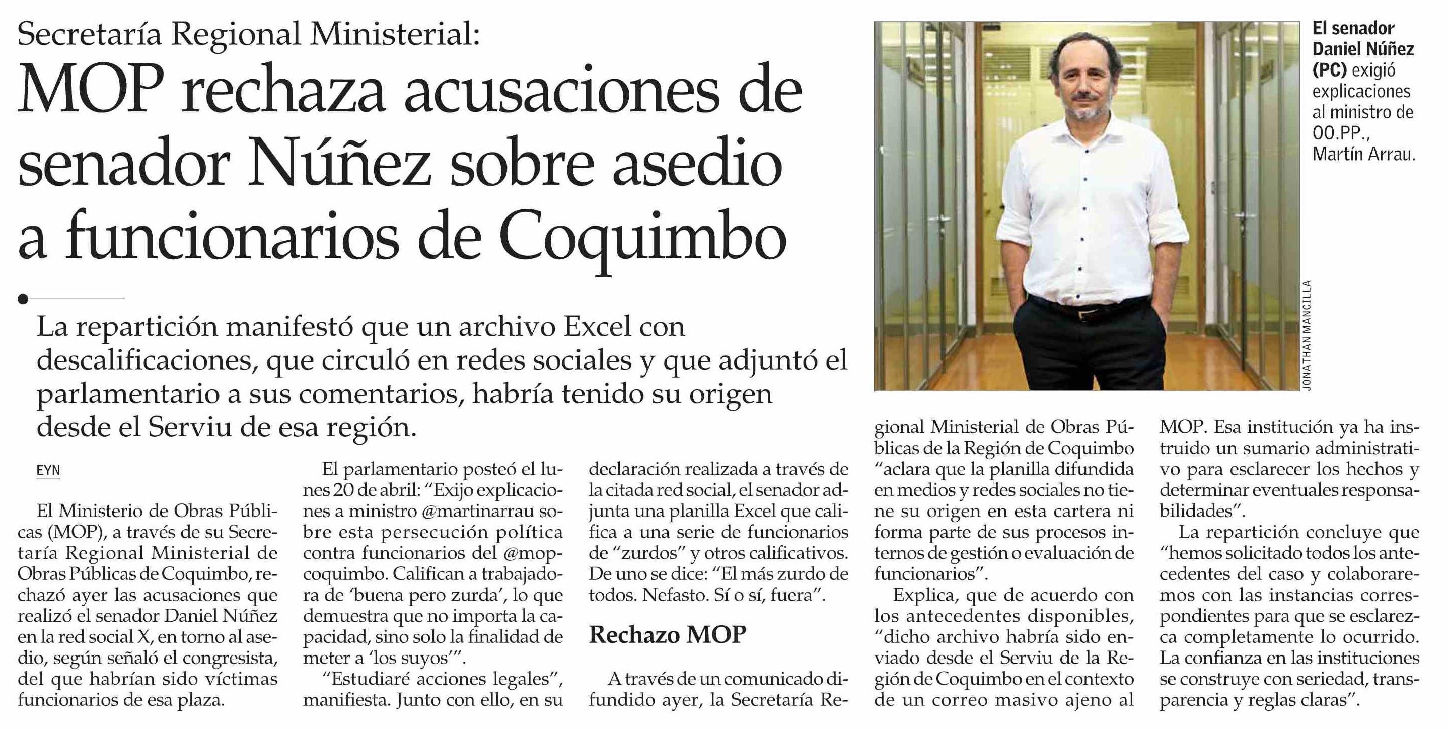MOP rechaza acusaciones de senador Núñez sobre asedio a funcionarios de Coquimbo 22-04-2026 El Mercurio |