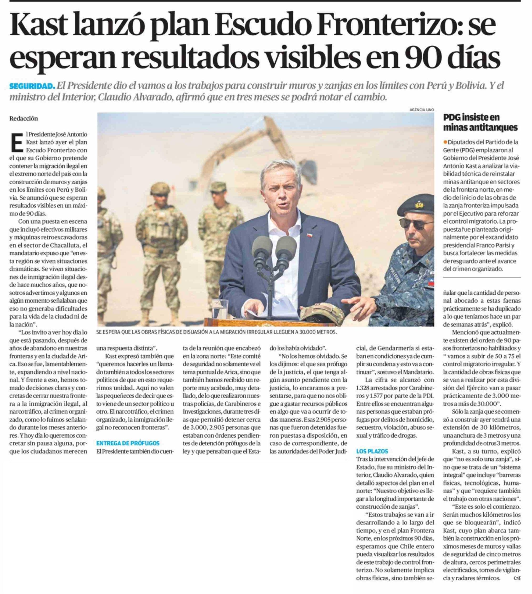 Kast lanzó plan Escudo Fronterizo: se esperan resultados visibles en 90 días 17-03-2026 El Diario de Atacama |