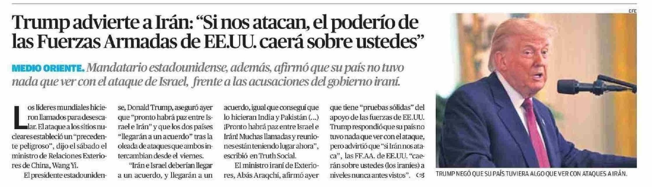 Trump advierte a Irán: "Si nos atacan, el poderío de las Fuerzas Armadas de EE.UU. caerá sobre ustedes" 16-06-2025 El Mercurio de Calama |