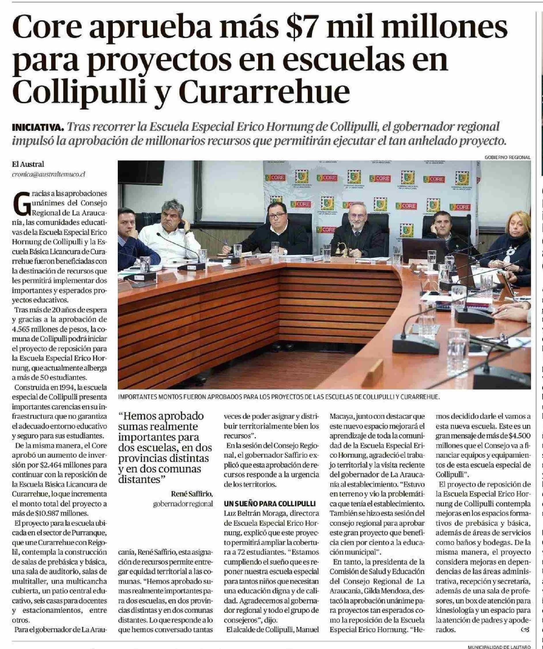 Título: Core aprueba más $7 mil millones para proyectos en escuelas en Collipulli y Curarrehue