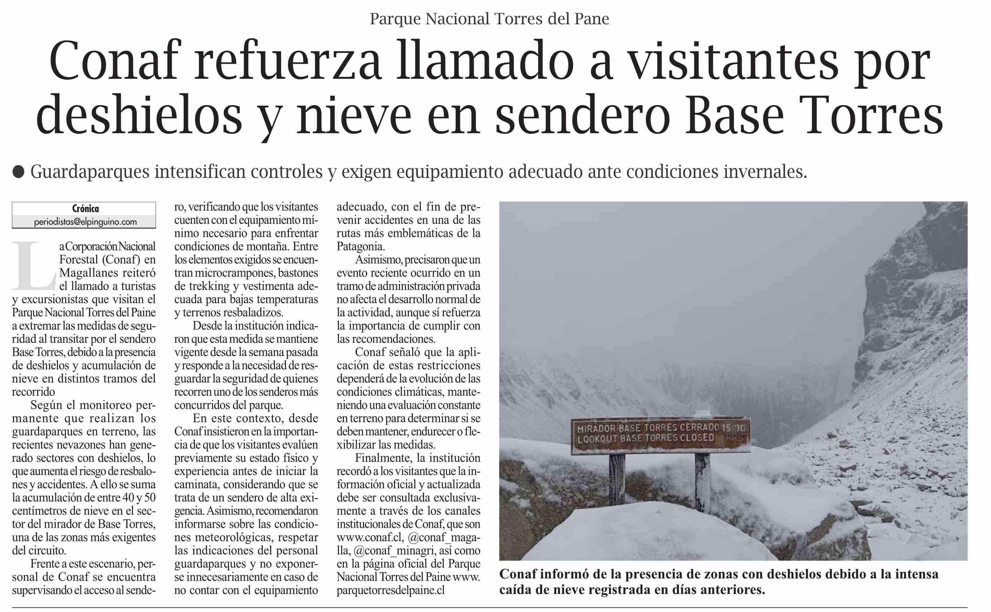 Conaf refuerza llamado a visitantes por deshielos y nieve en sendero Base Torres 06-04-2026 El Pingüino |