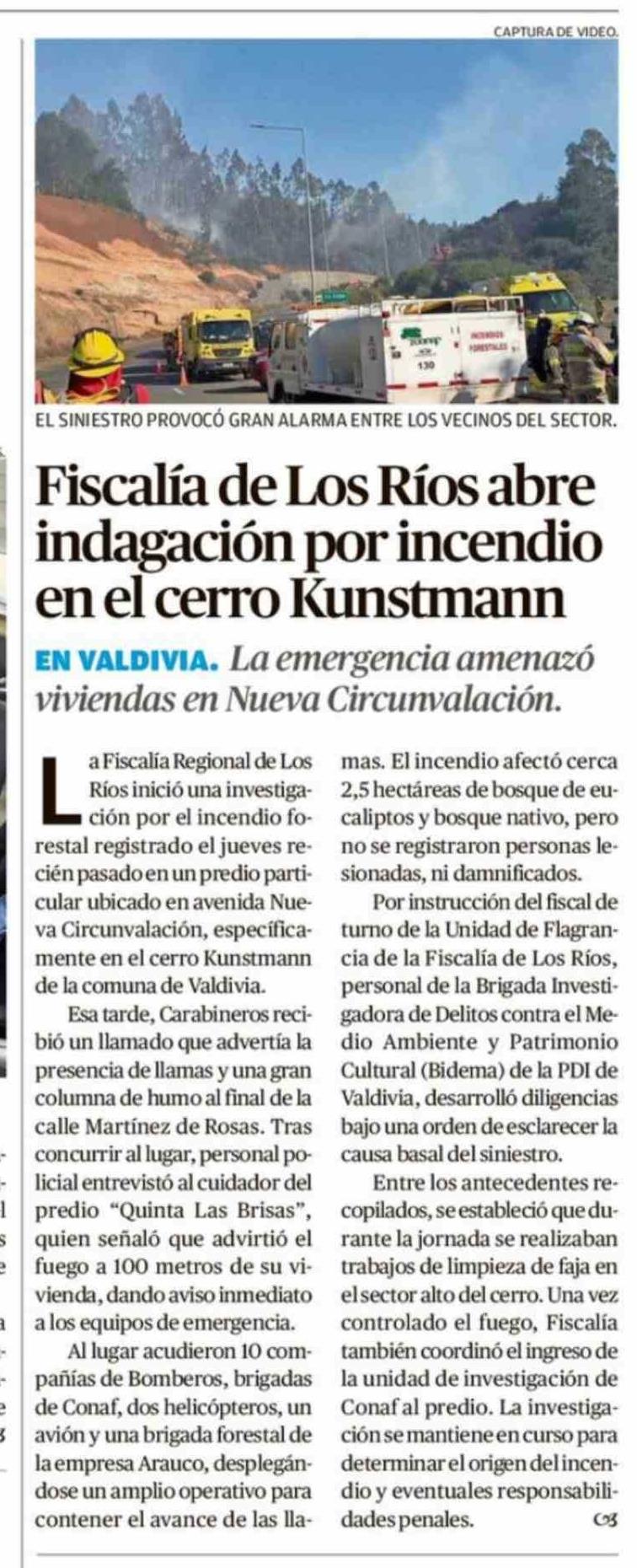 Título: Fiscalía de Los Ríos abre indagación por incendio en el cerro Kunstmann