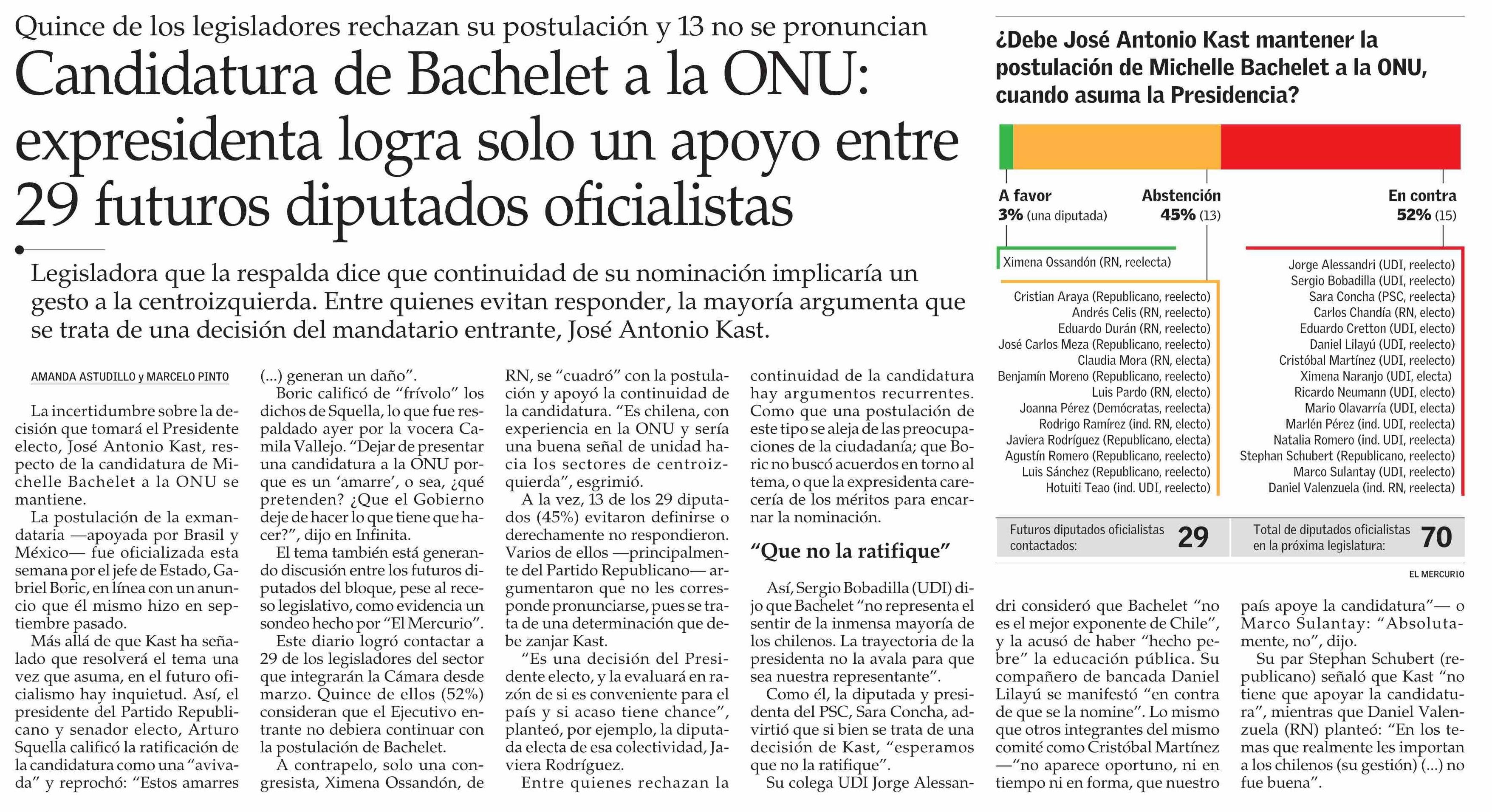 Candidatura de Bachelet a la ONU: expresidenta logra solo un apoyo entre 29 futuros diputados oficialistas 05-02-2026 El Mercurio |