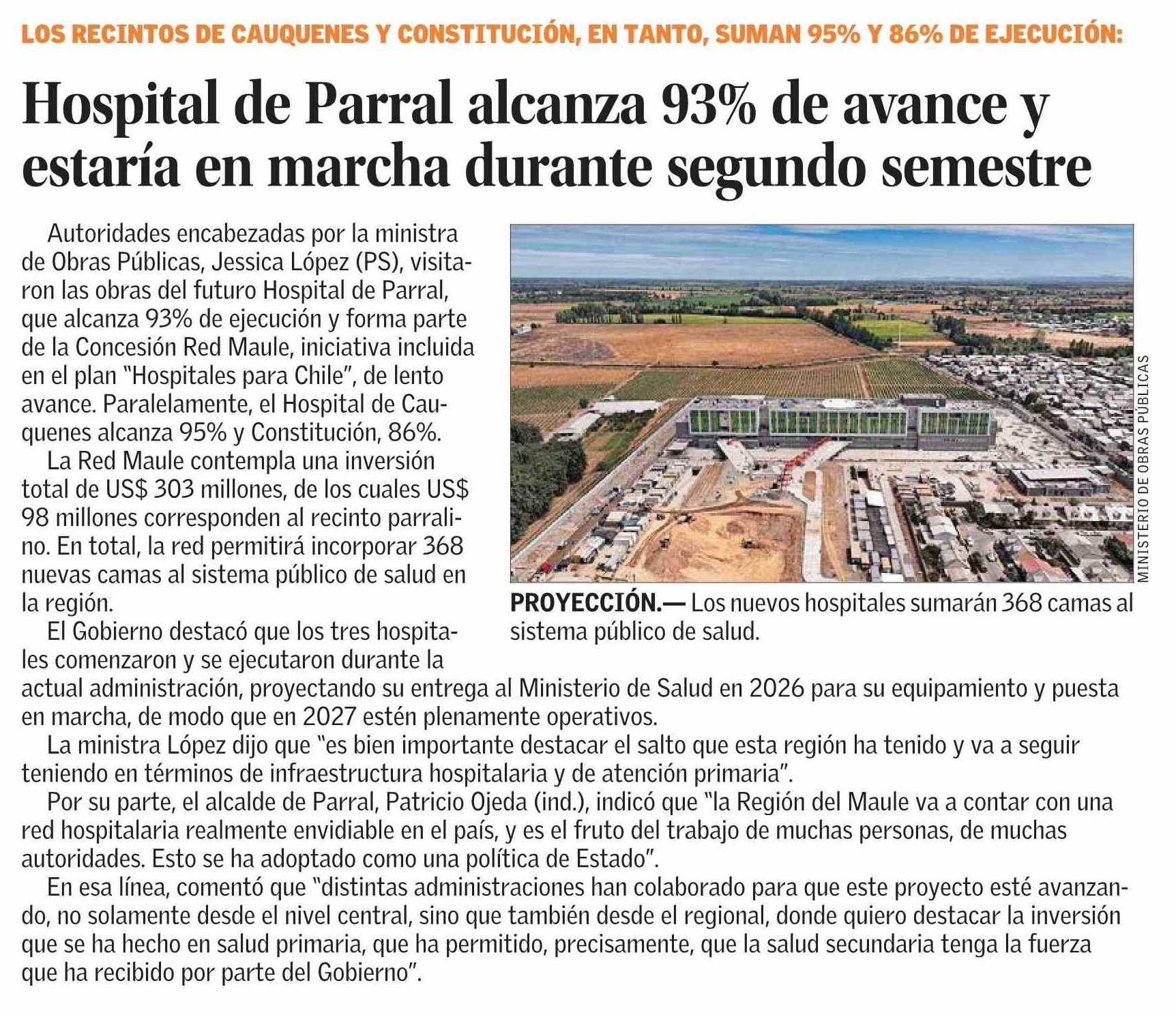 Hospital de Parral alcanza 93% de avance y estaría en marcha durante segundo semestre 13-02-2026 El Mercurio |