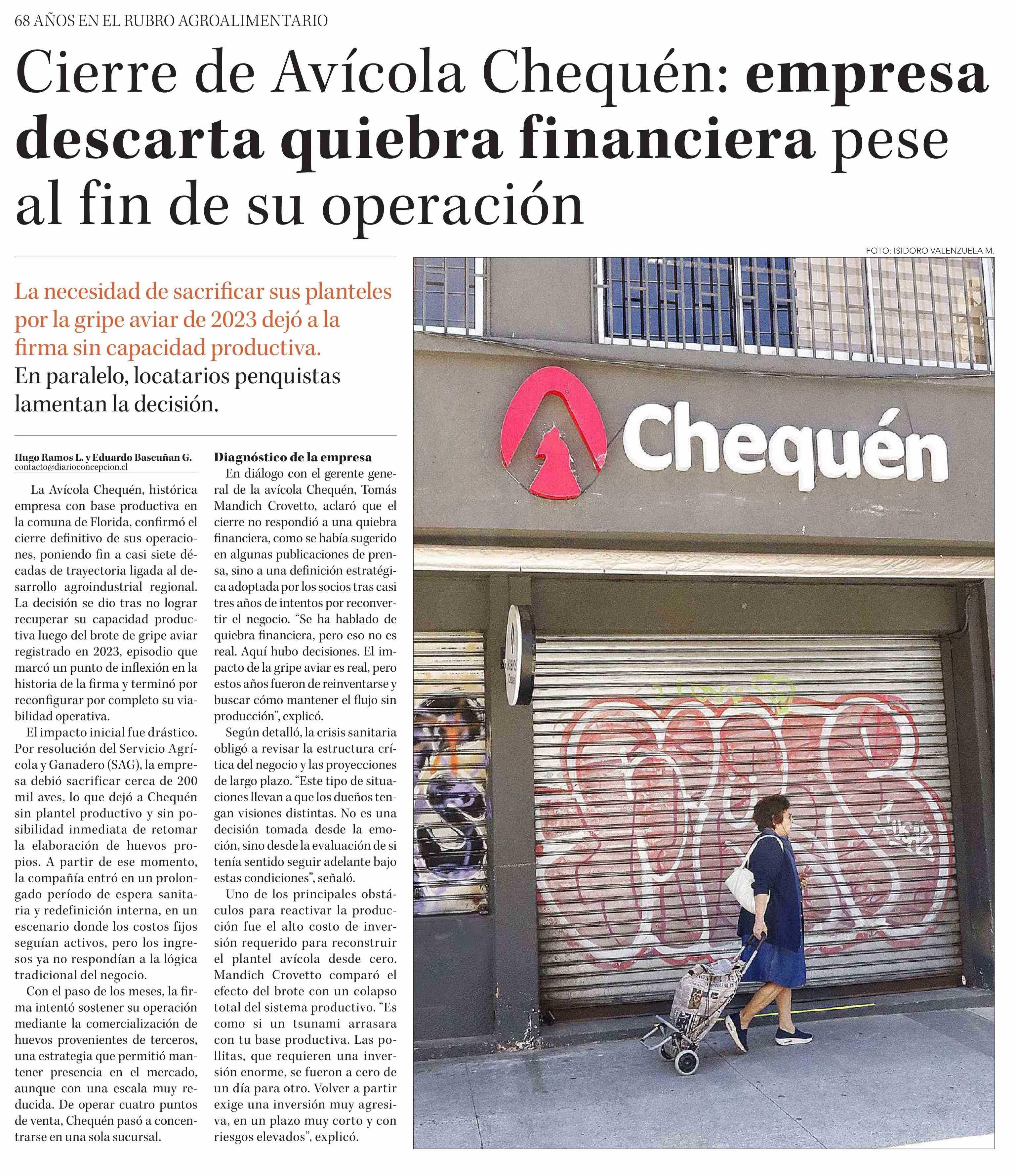Cierre de Avícola Chequén: empresa descarta quiebra financiera pese al fin de su operación 06-02-2026 Diario Concepción |