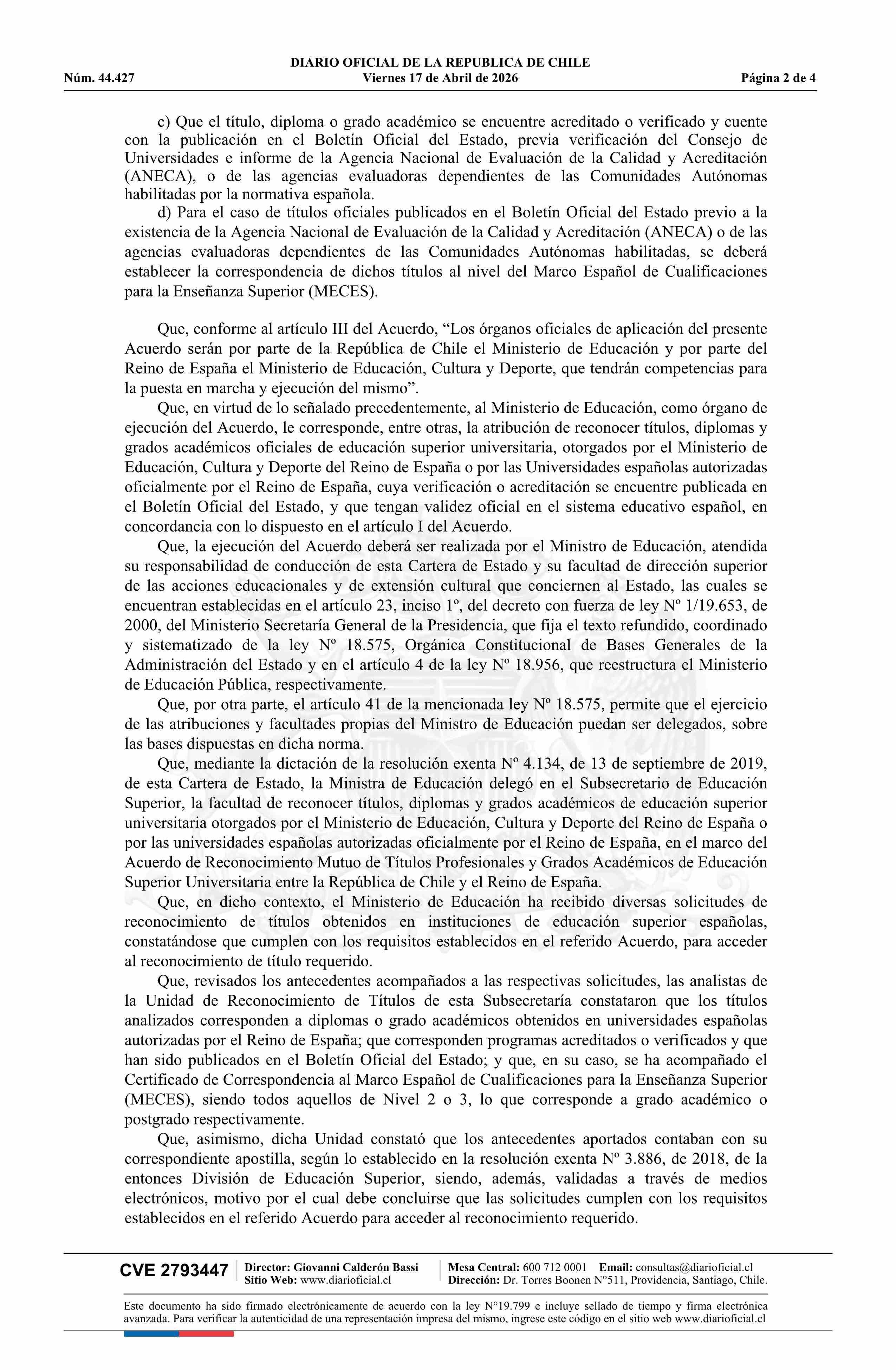 | Título: | Resolución exenta número 1.298, de 2026.- Reconoce títulos expedidos por universidades españolas que indica, en el marco del Acuerdo de Reconocimiento Mutuo de Títulos Profesionales y Grados Académicos de Educación Superior Universitaria entre la República de Chile y el Reino de España |