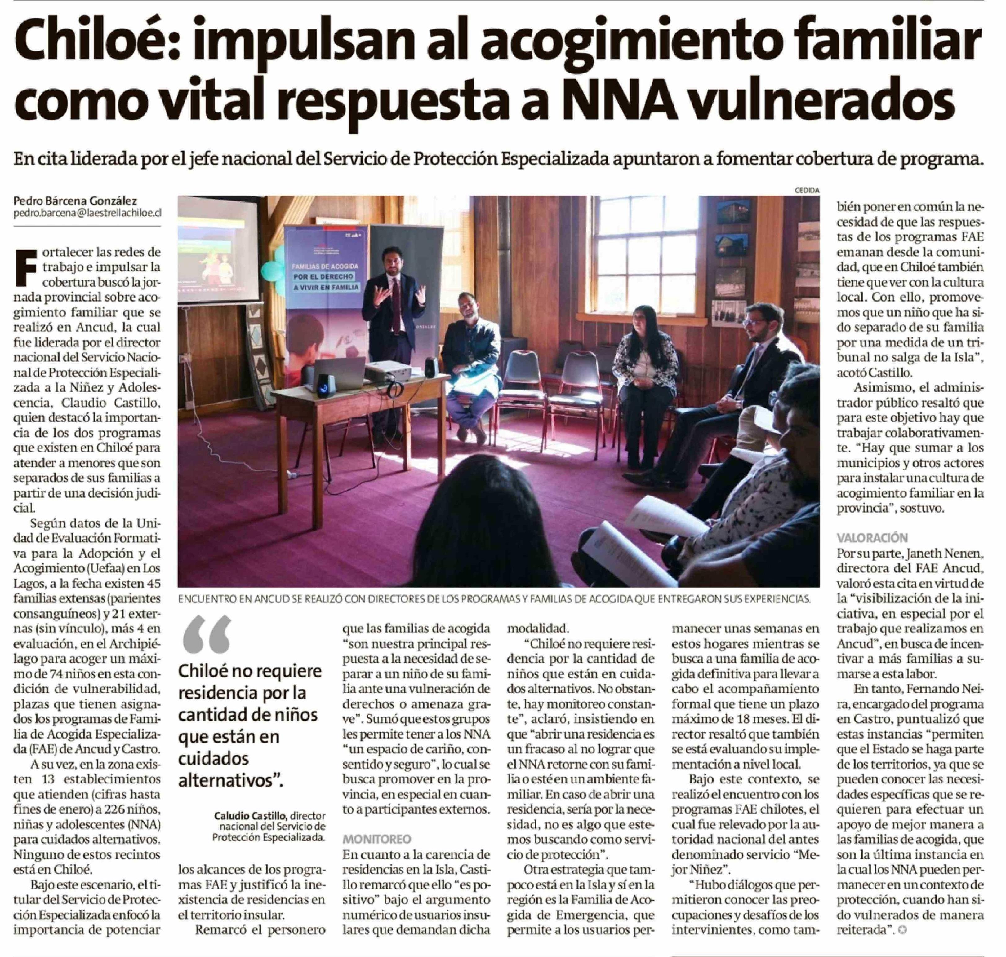 Chiloé: impulsan al acogimiento familiar como vital respuesta a NNA vulnerados 17-02-2026 La Estrella de Chiloé |