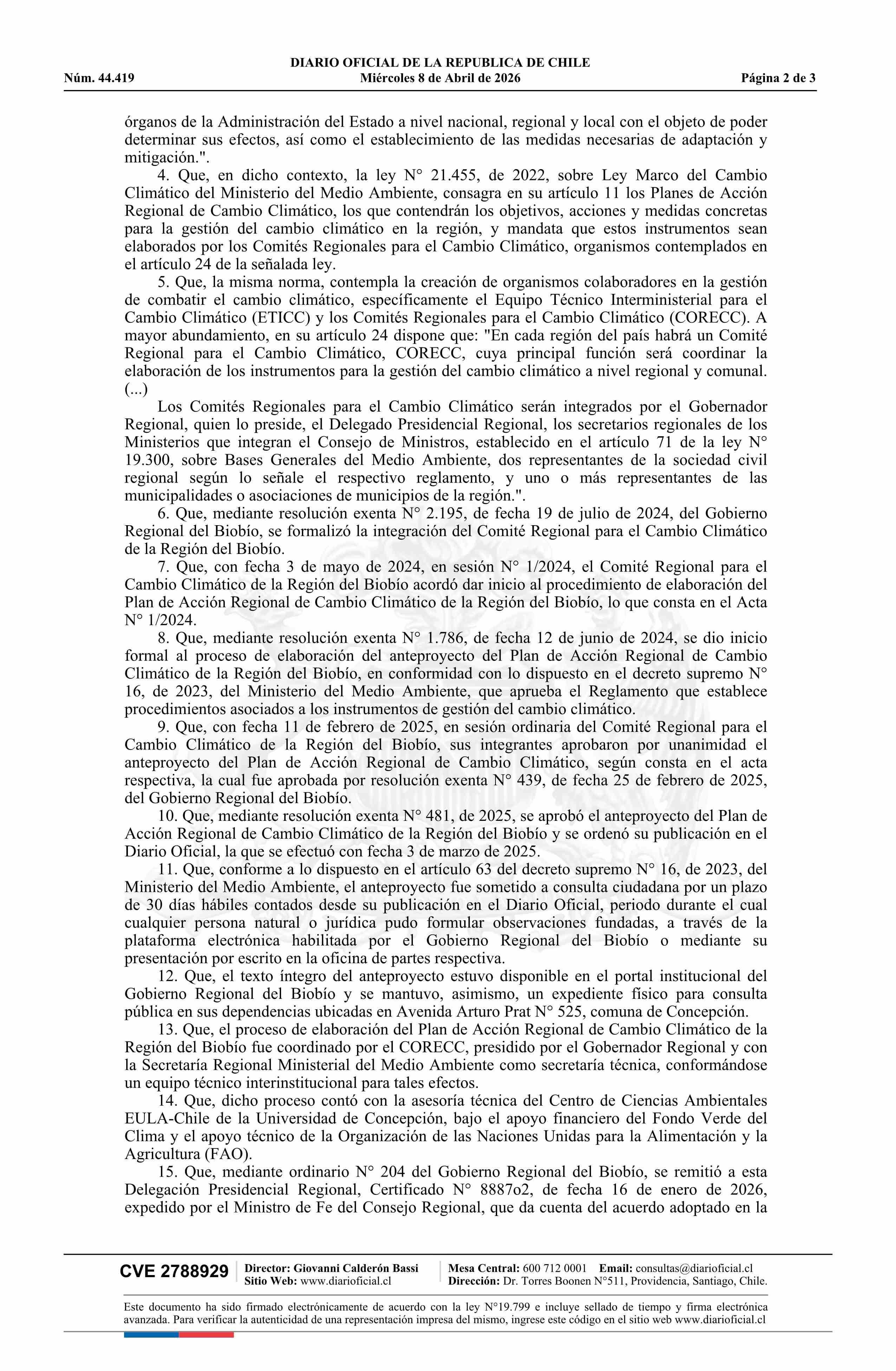 Resolución exenta número 127, de 2026.- Aprueba Plan de Acción Regional de Cambio Climático de la Región del Biobío 08-04-2026 Diario Oficial Edición Electrónica |