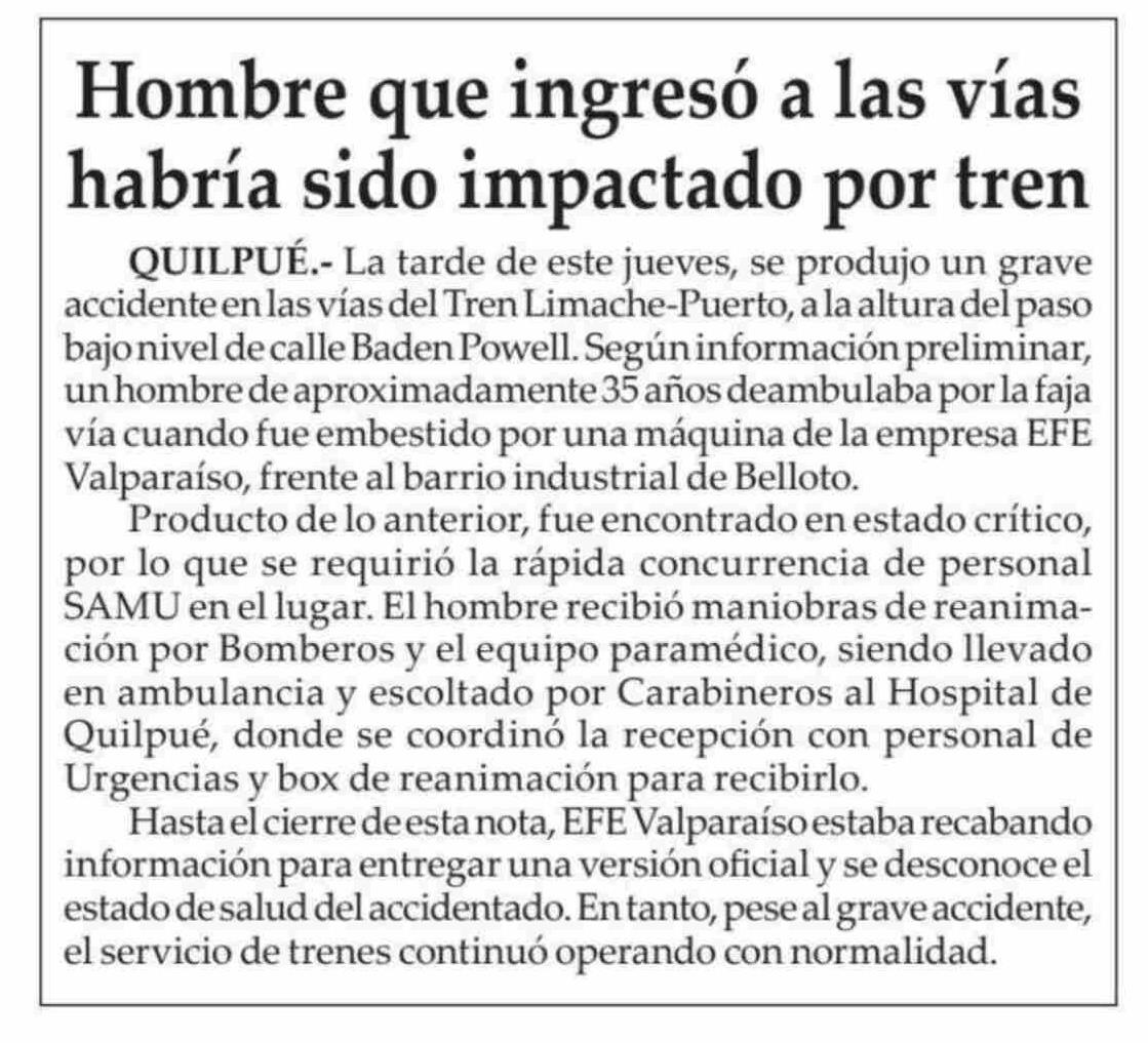 | Título: | Hombre que ingresó a las vías habría sido impactado por tren |