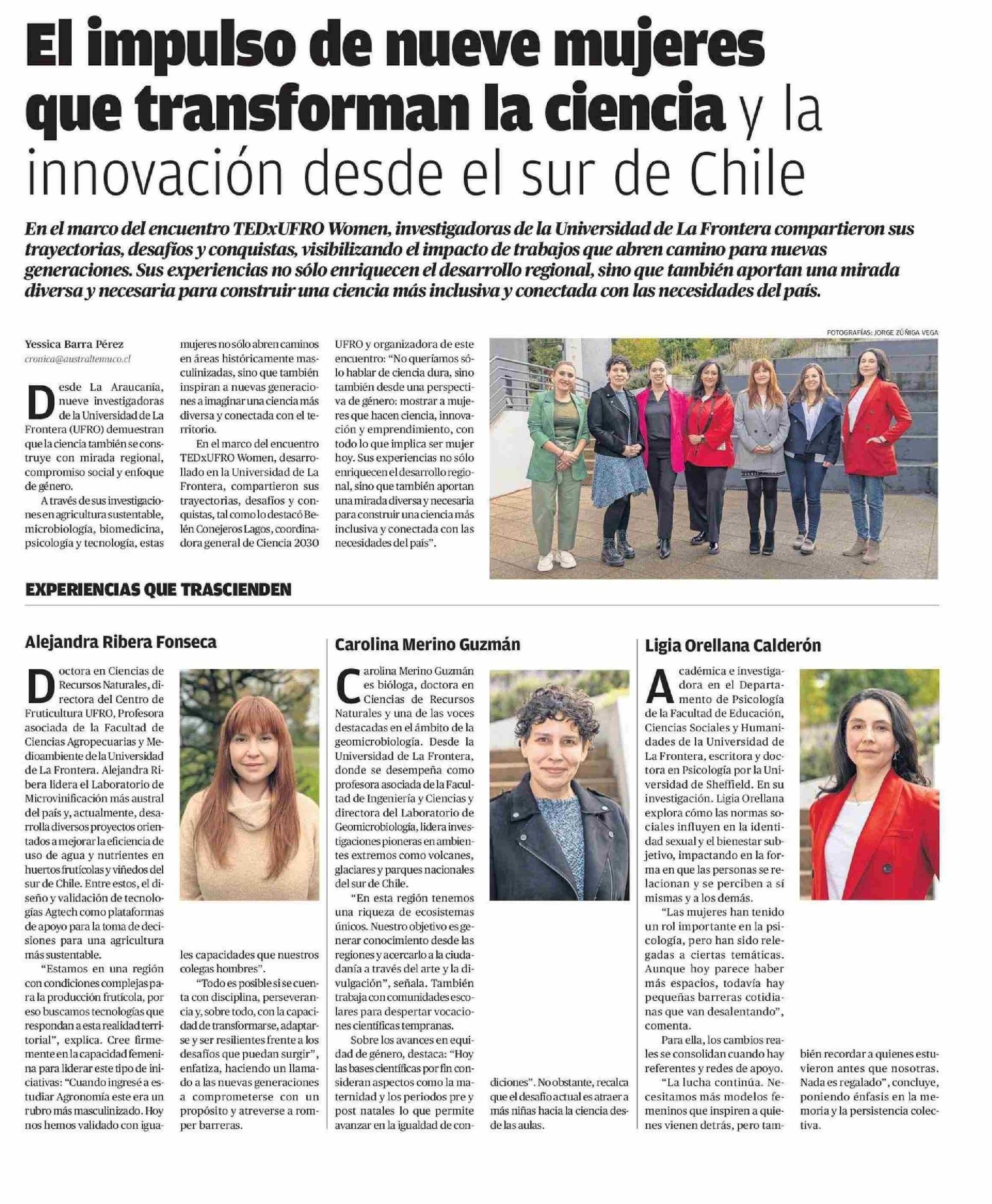 El impulso de nueve mujeres que transforman la ciencia y la innovación desde el sur de Chile 04-05-2025 El Austral de la Araucanía |