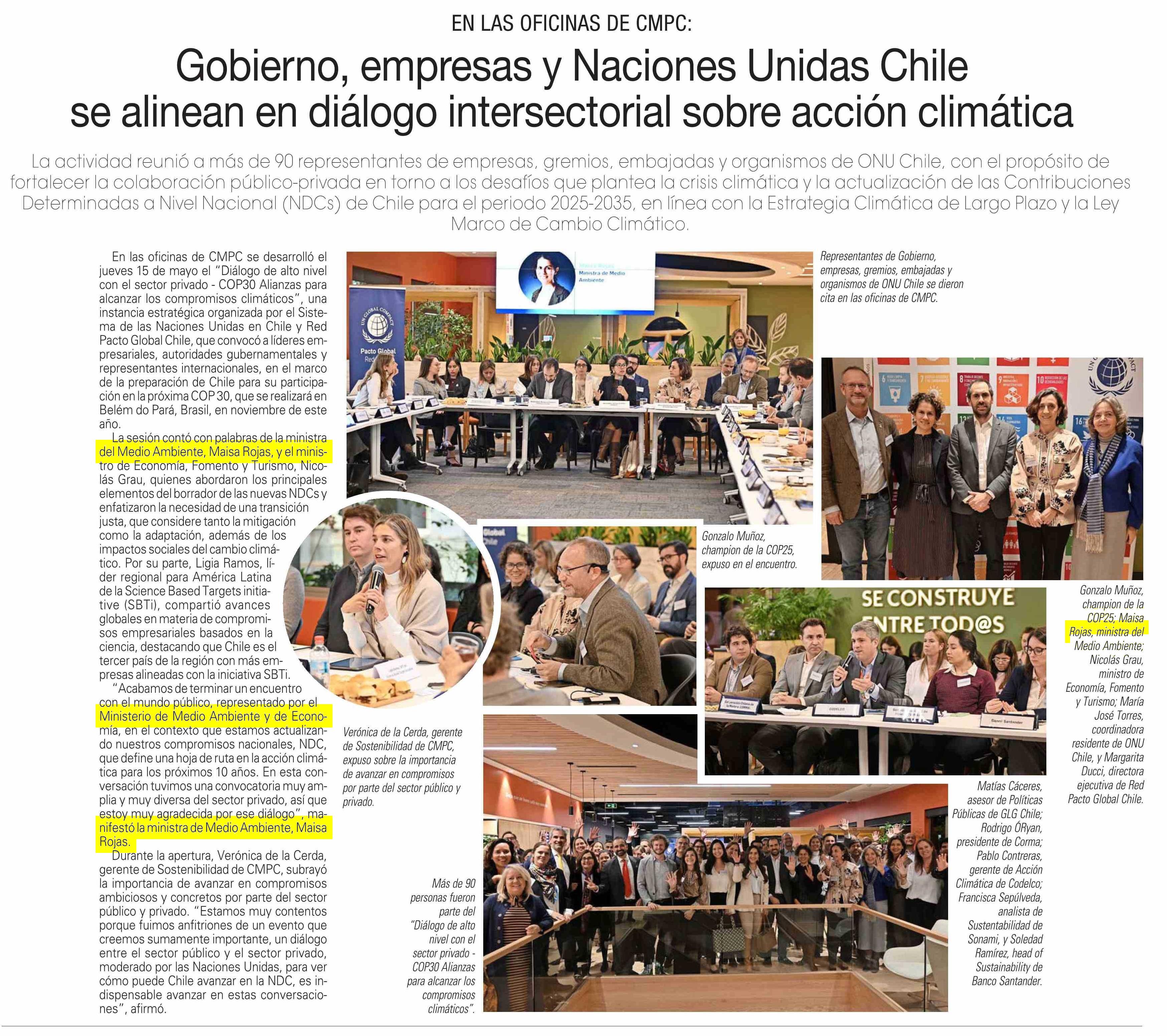 Gobierno, empresas y Naciones Unidas Chile se alinean en diálogo intersectorial sobre acción climática 18-05-2025 El Mercurio |