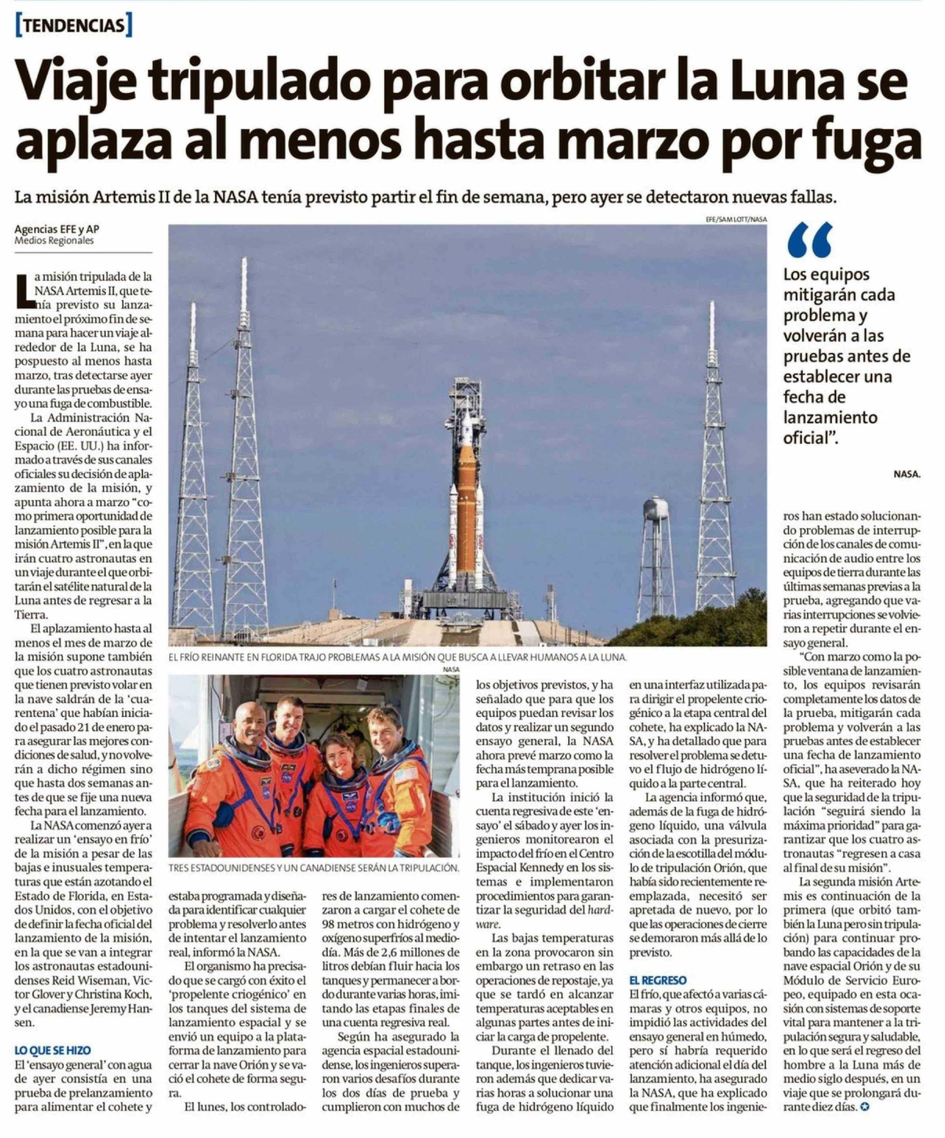 Viaje tripulado para orbitar la Luna se aplaza al menos hasta marzo por fuga 04-02-2026 La Estrella de Chiloé |