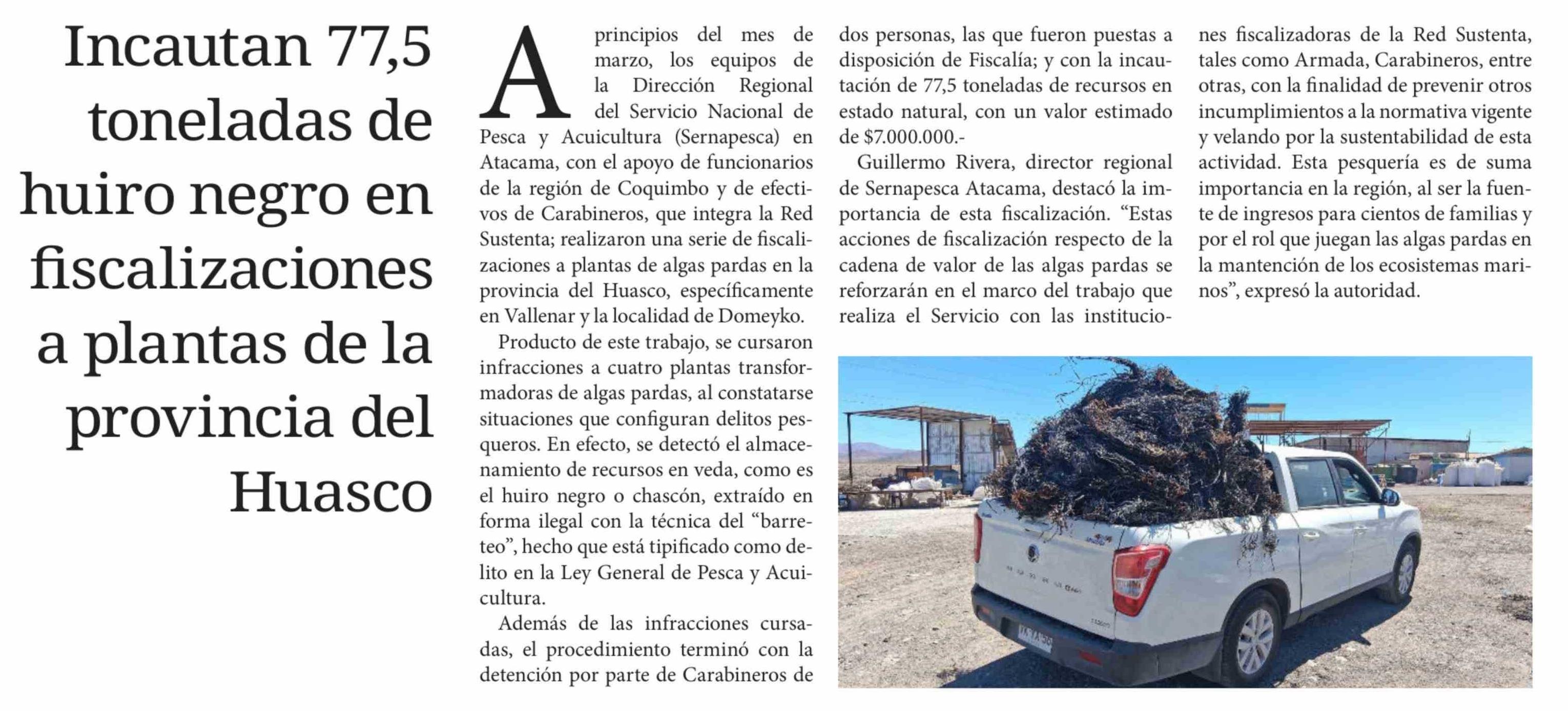 Incautan 77,5 toneladas de huiro negro en fiscalizaciones a plantas de la provincia del Huasco 13-03-2026 Diario Chañarcillo |