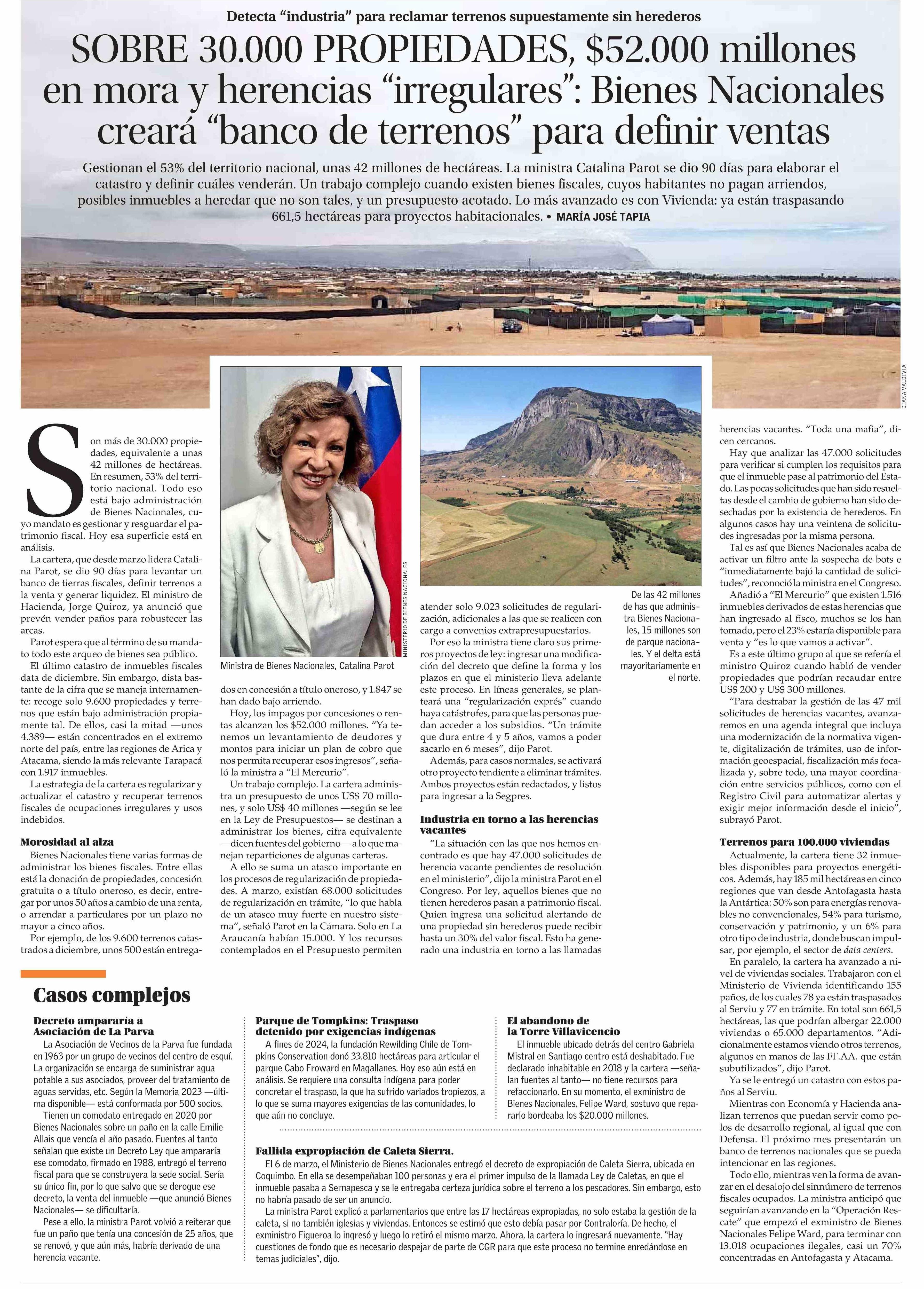 SOBRE 30.000 PROPIEDADES, $52.000 millones en mora y herencias “irregulares”: Bienes Nacionales creará “banco de terrenos” para definir ventas 19-04-2026 El Mercurio |