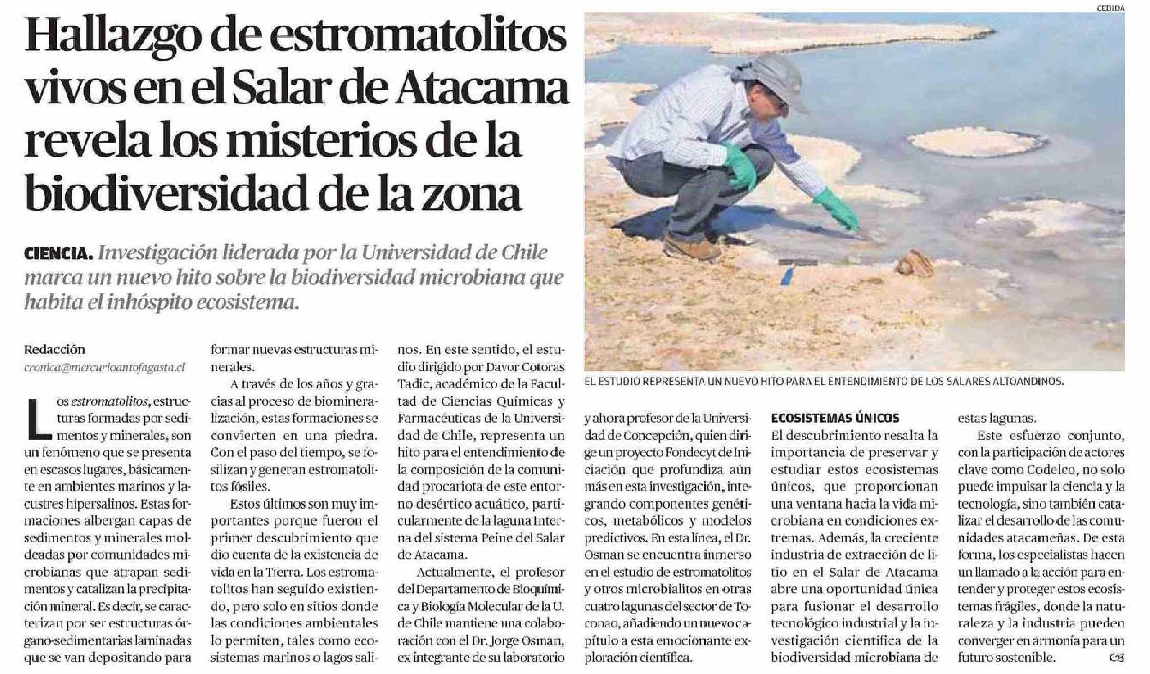 Hallazgo de estromatolitos vivos en el Salar de Atacama revela los misterios de la biodiversidad de la zona 29-05-2024 El Mercurio de Calama |