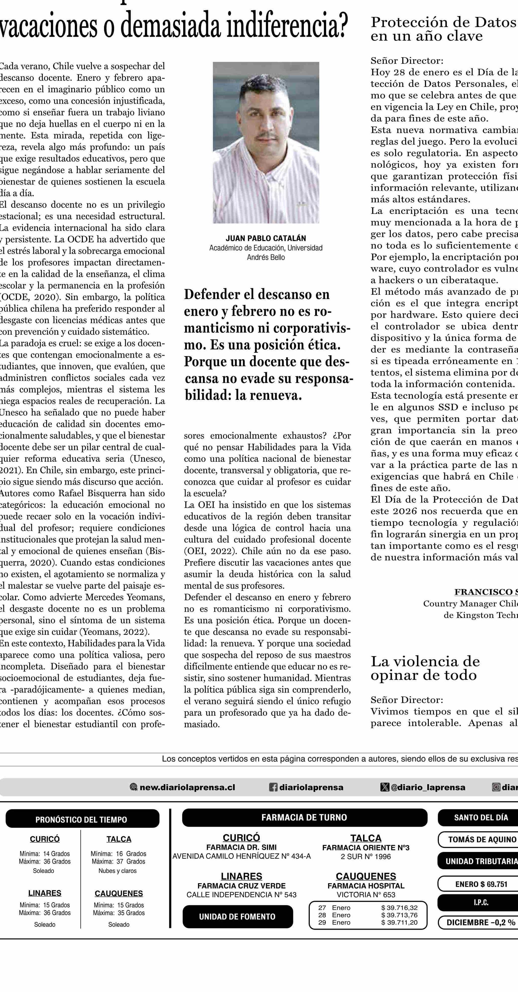 Columnas de Opinión: Descanso de profesores: ¿Demasiadas vacaciones o demasiada indiferencia? 28-01-2026 La Prensa de Curicó |