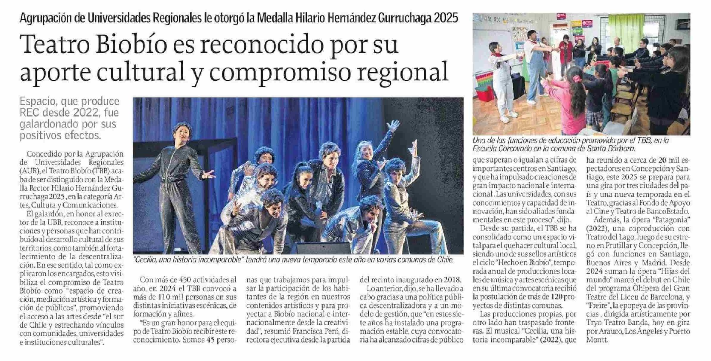 Teatro Biobío es reconocido por su aporte cultural y compromiso regional 26-06-2025 El Sur |