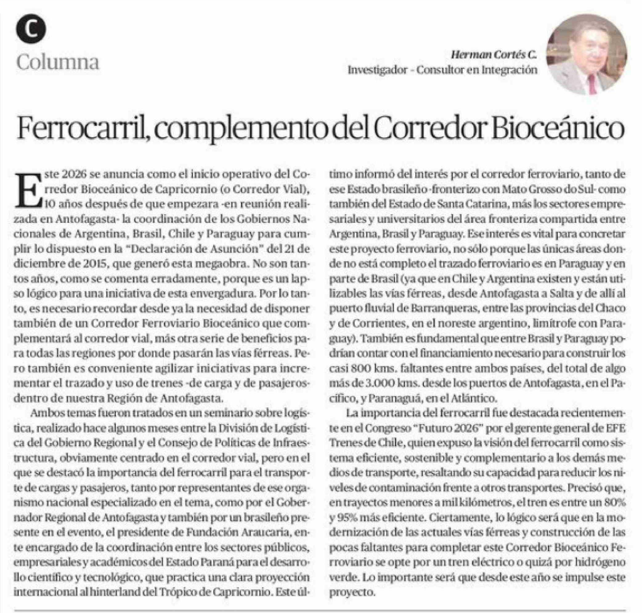 Columnas de Opinión: Ferrocarril, complemento del Corredor Bioceánico 04-02-2026 El Mercurio de Calama |