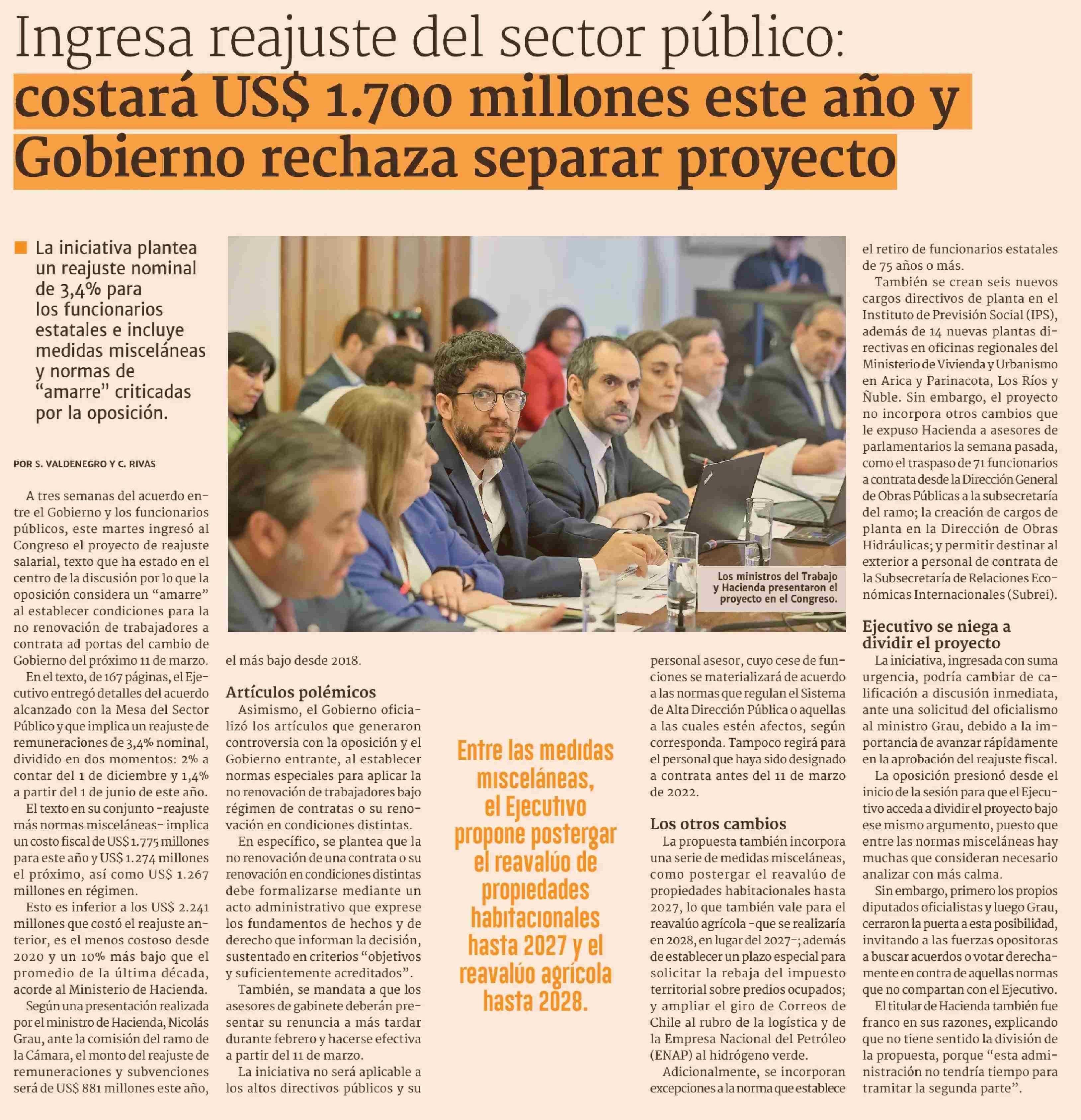 Ingresa reajuste del sector público: costará US$ 1.700 millones este año y Gobierno rechaza separar proyecto 07-01-2026 Diario Financiero |