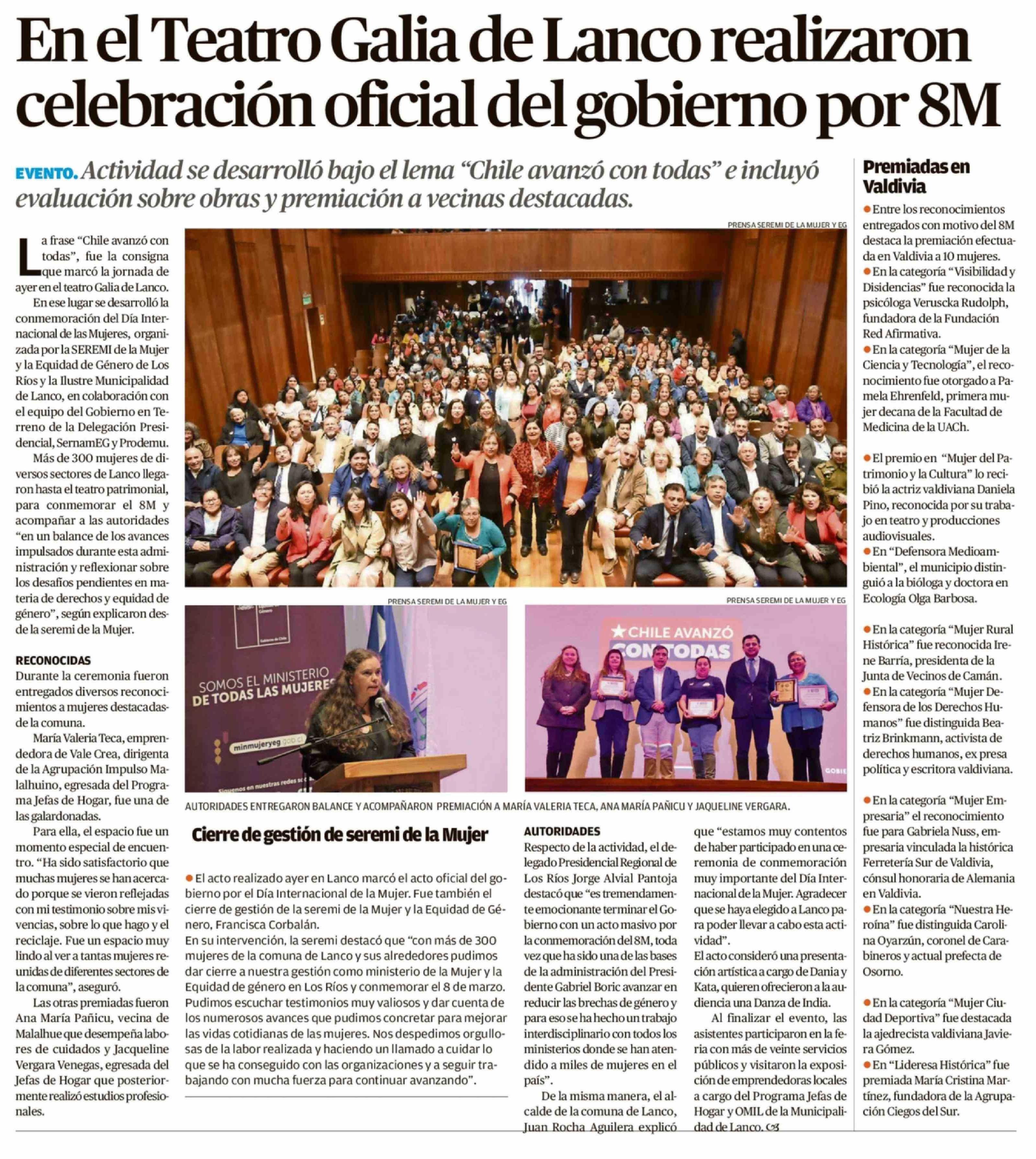 Título: En el Teatro Galia de Lanco realizaron celebración oficial del gobierno por 8M