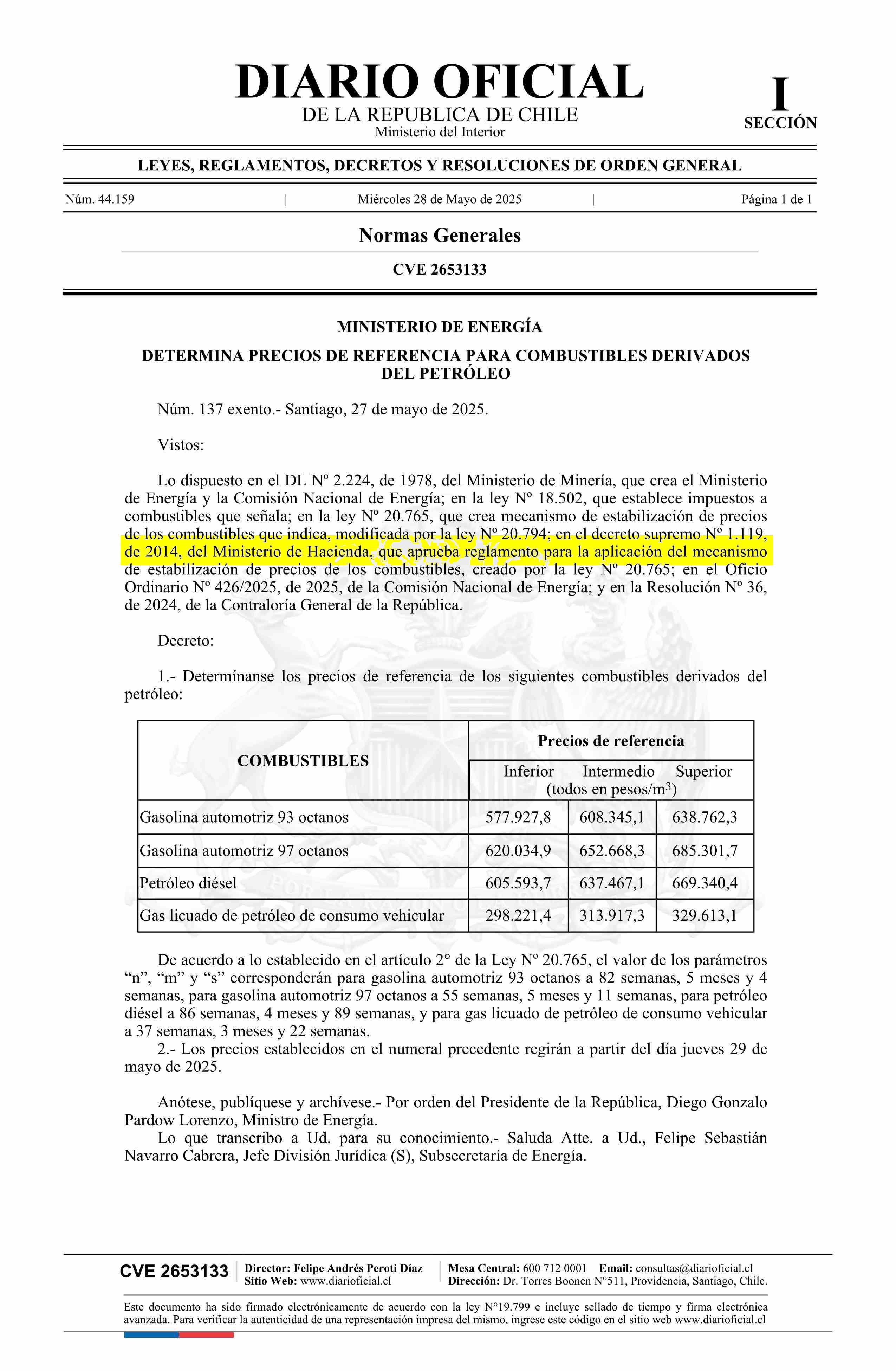 Decreto exento número 137, de 2025.- Determina precios de referencia para combustibles derivados del petróleo 28-05-2025 DIARIO OFICIAL CHILE - BOLETÍN OFICIAL DE MINERÍA |