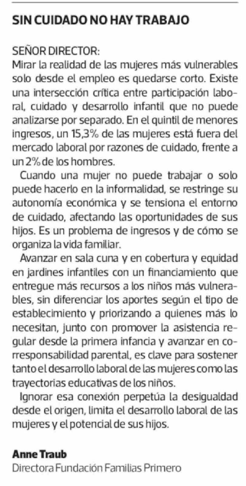 Cartas: SIN CUIDADO NO HAY TRABAJO