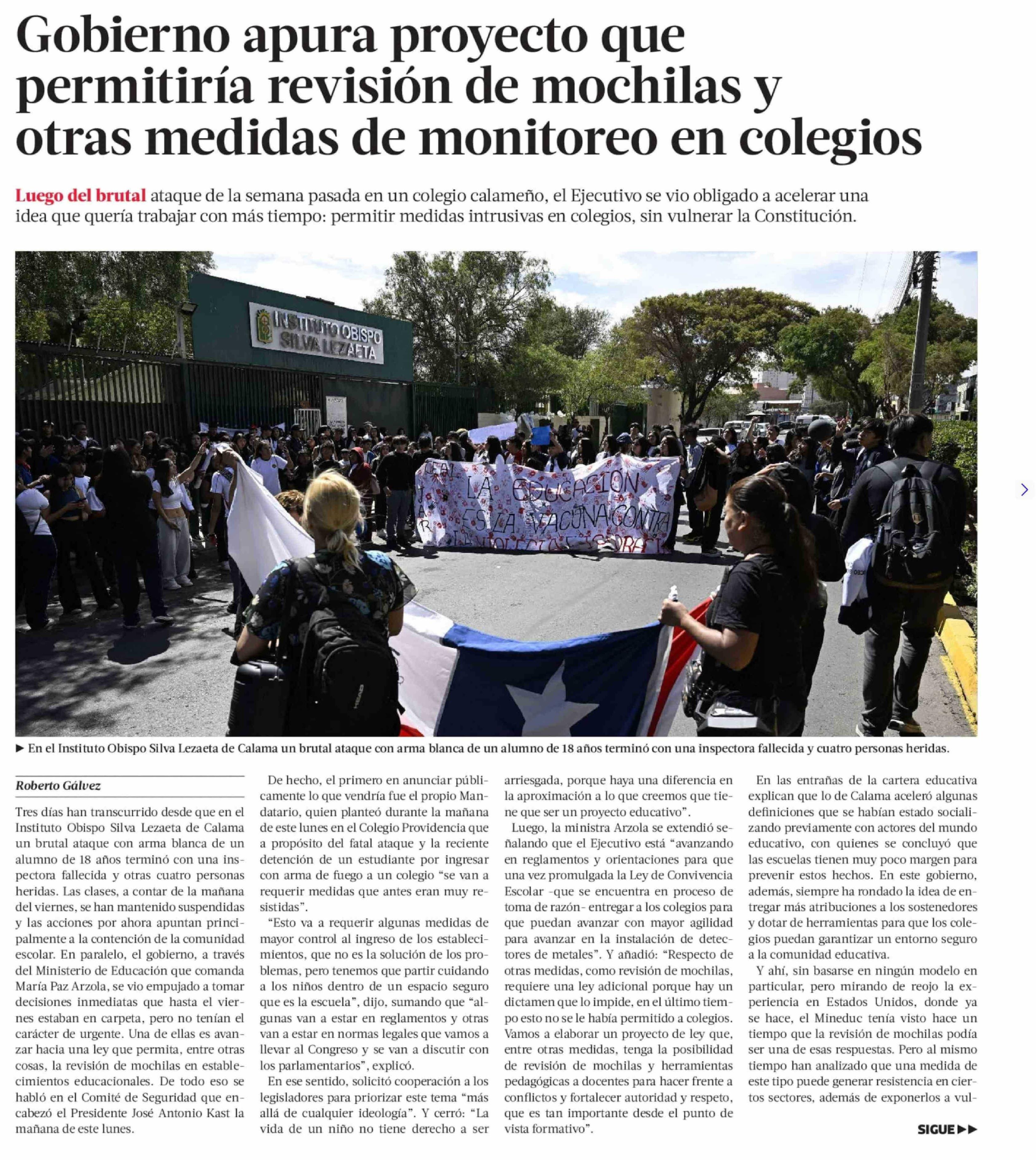 Gobierno apura proyecto que permitiría revisión de mochilas y otras medidas de monitoreo en colegios 31-03-2026 La Tercera |