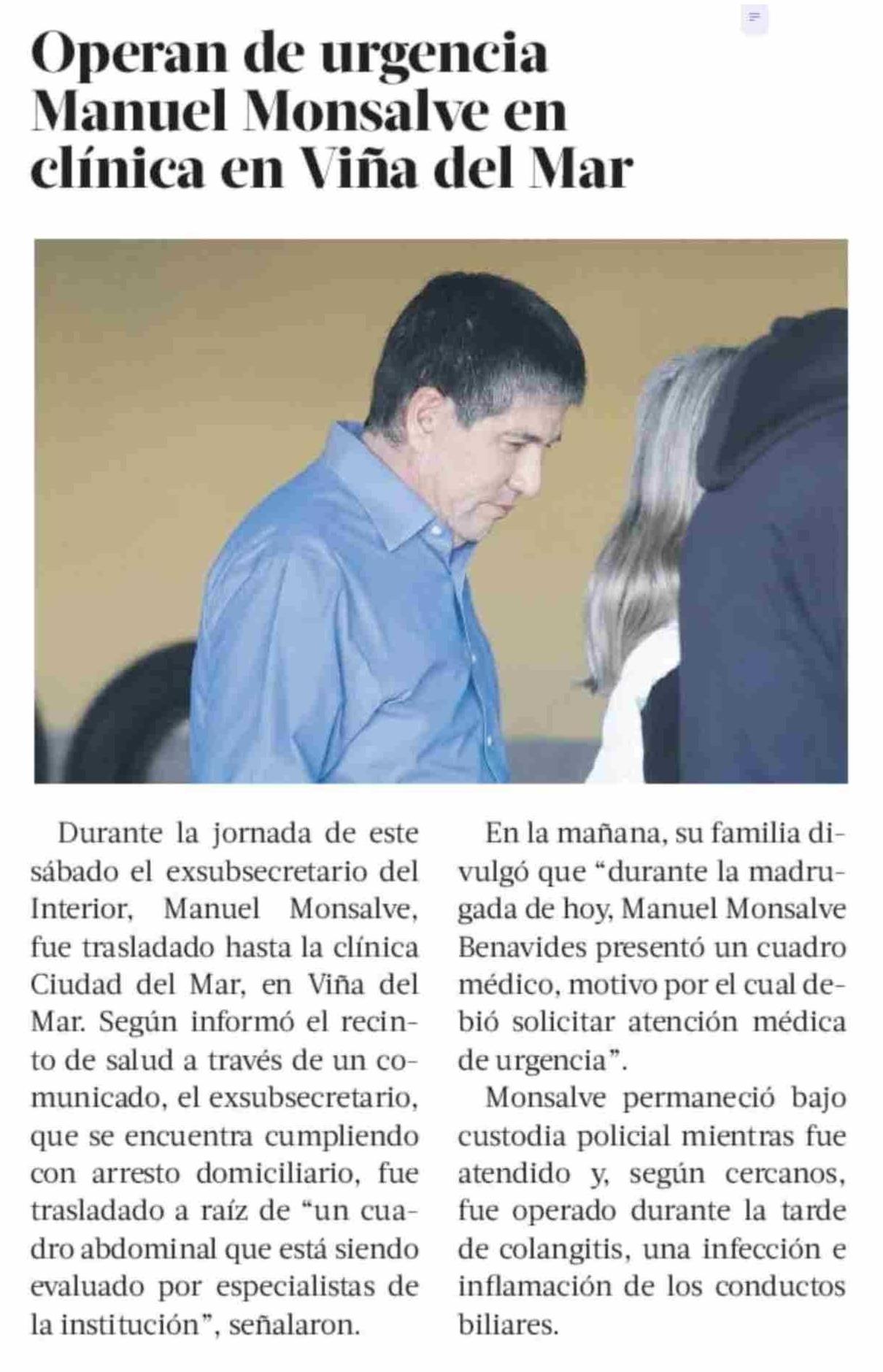 Operan de urgencia Manuel Monsalve en clínica en Viña del Mar 15-06-2025 La Tercera |